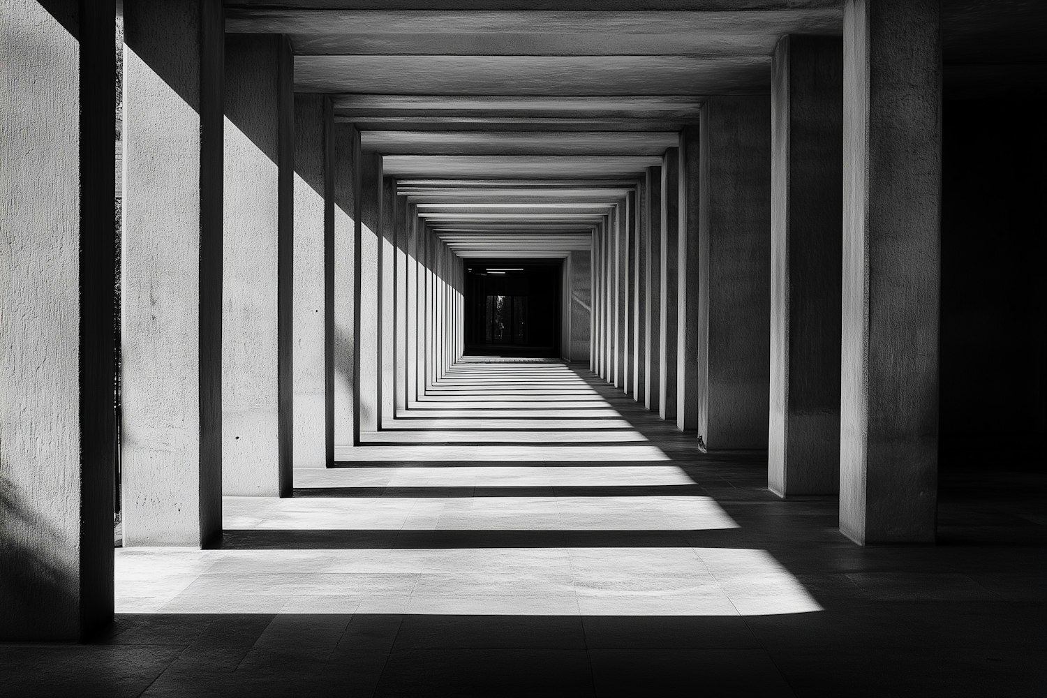 A striking black-and-white corridor with geometric columns casting rhythmic shadows, leading to a mysterious dark doorway.