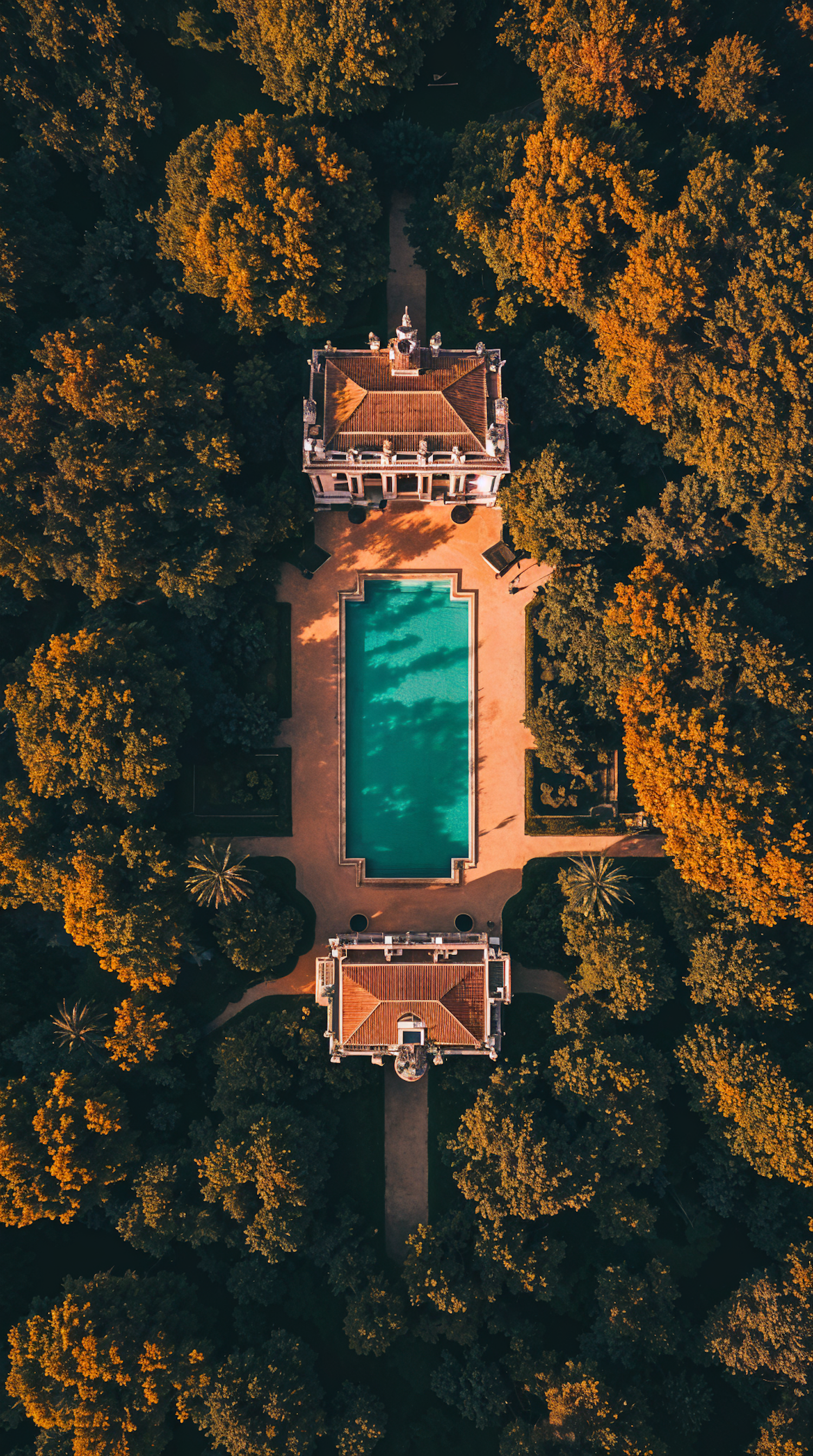 Aerial view of a symmetrical garden with a central pool, flanked by two classical buildings and surrounded by autumnal trees.