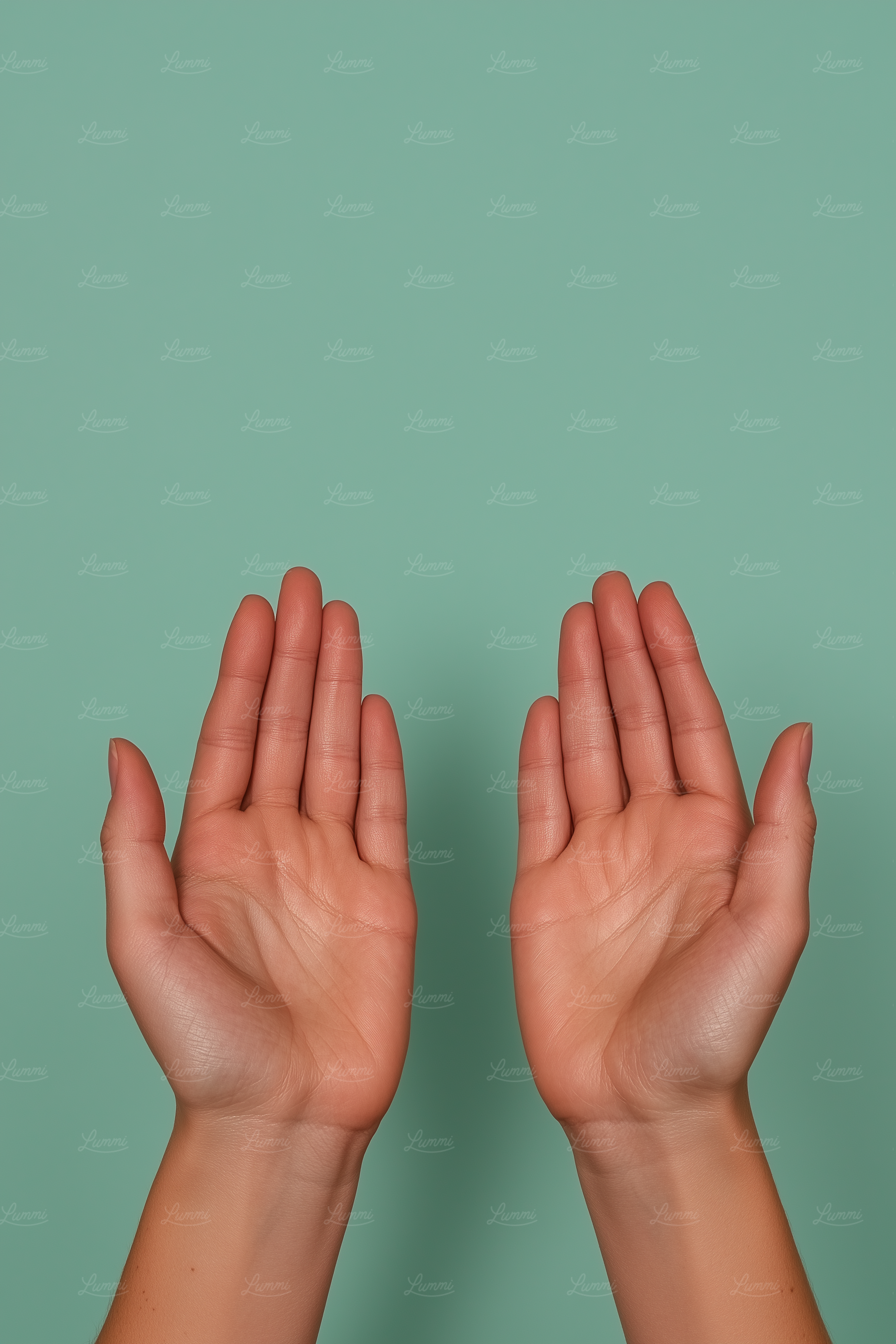 Two open hands with smooth skin and manicured nails against a mint green background, creating a clean and minimalistic look.