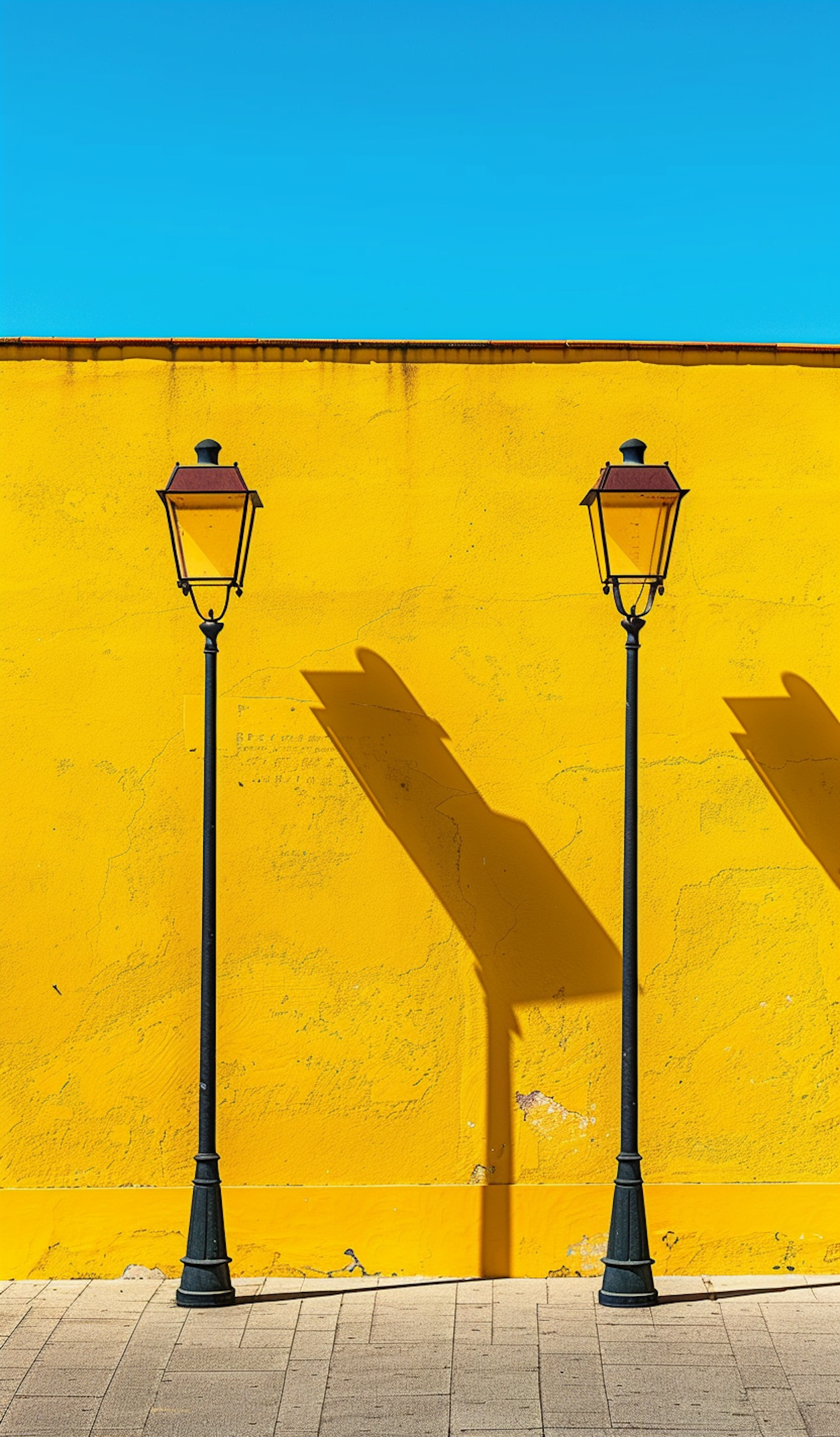 Symmetrical Street Lamps Against Vibrant Yellow Wall