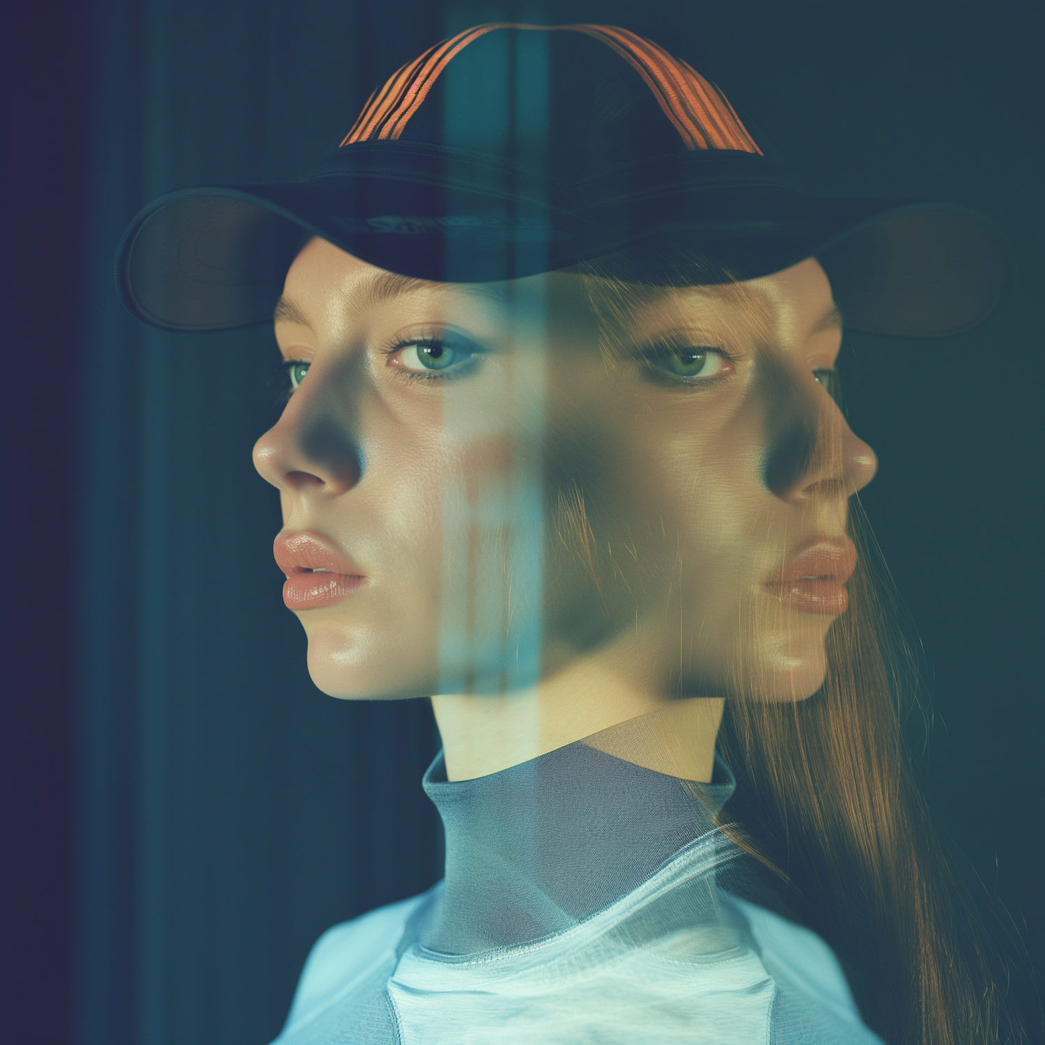 Artistic portrait of a woman in a cap with a double exposure effect, highlighting her blue eyes and soft lighting.