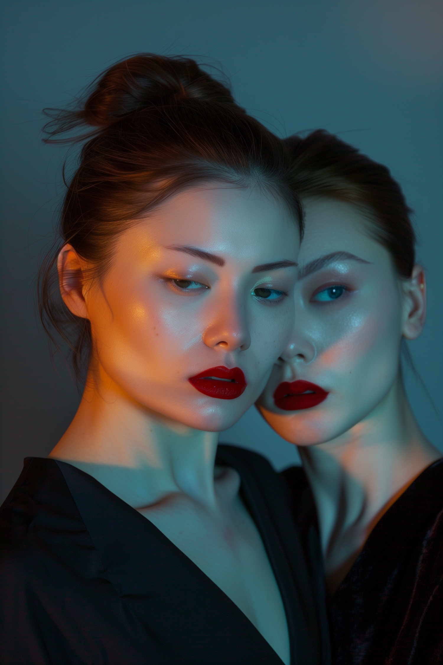 Two Asian women with red lipstick and dramatic lighting create a mirrored effect, highlighting their features against a muted blue background.
