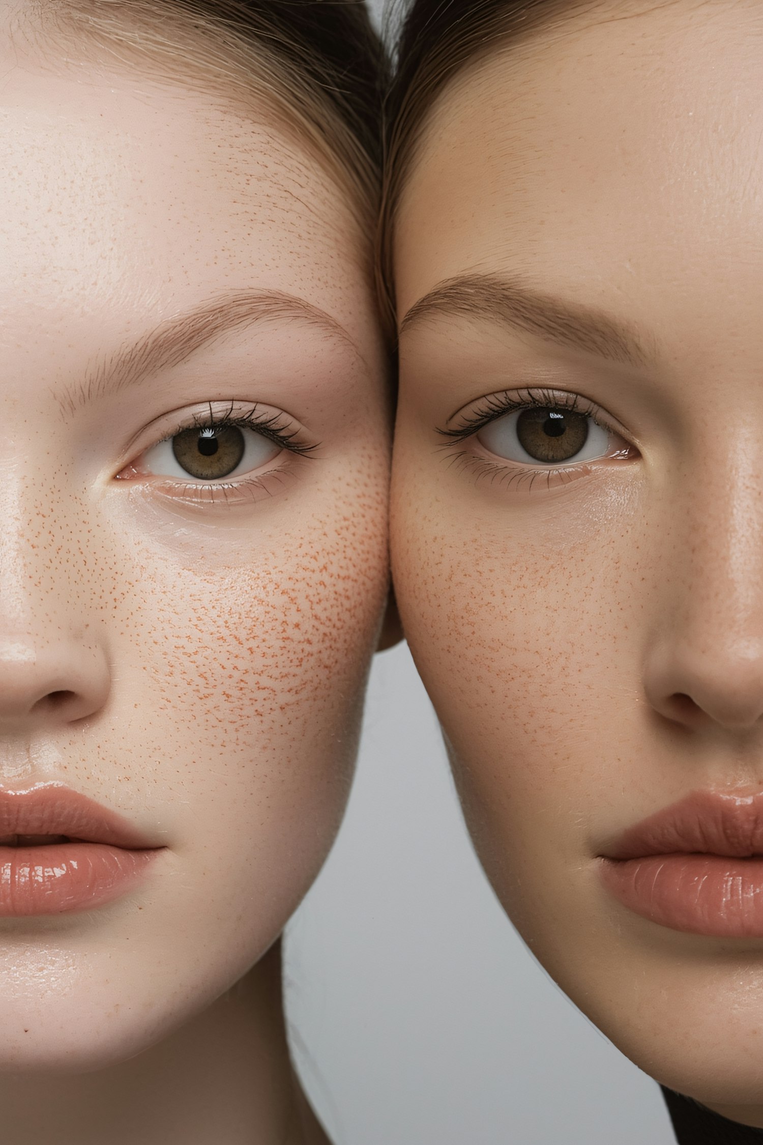 Close-up of two freckled faces with hazel eyes, showcasing natural beauty and symmetry in soft lighting.