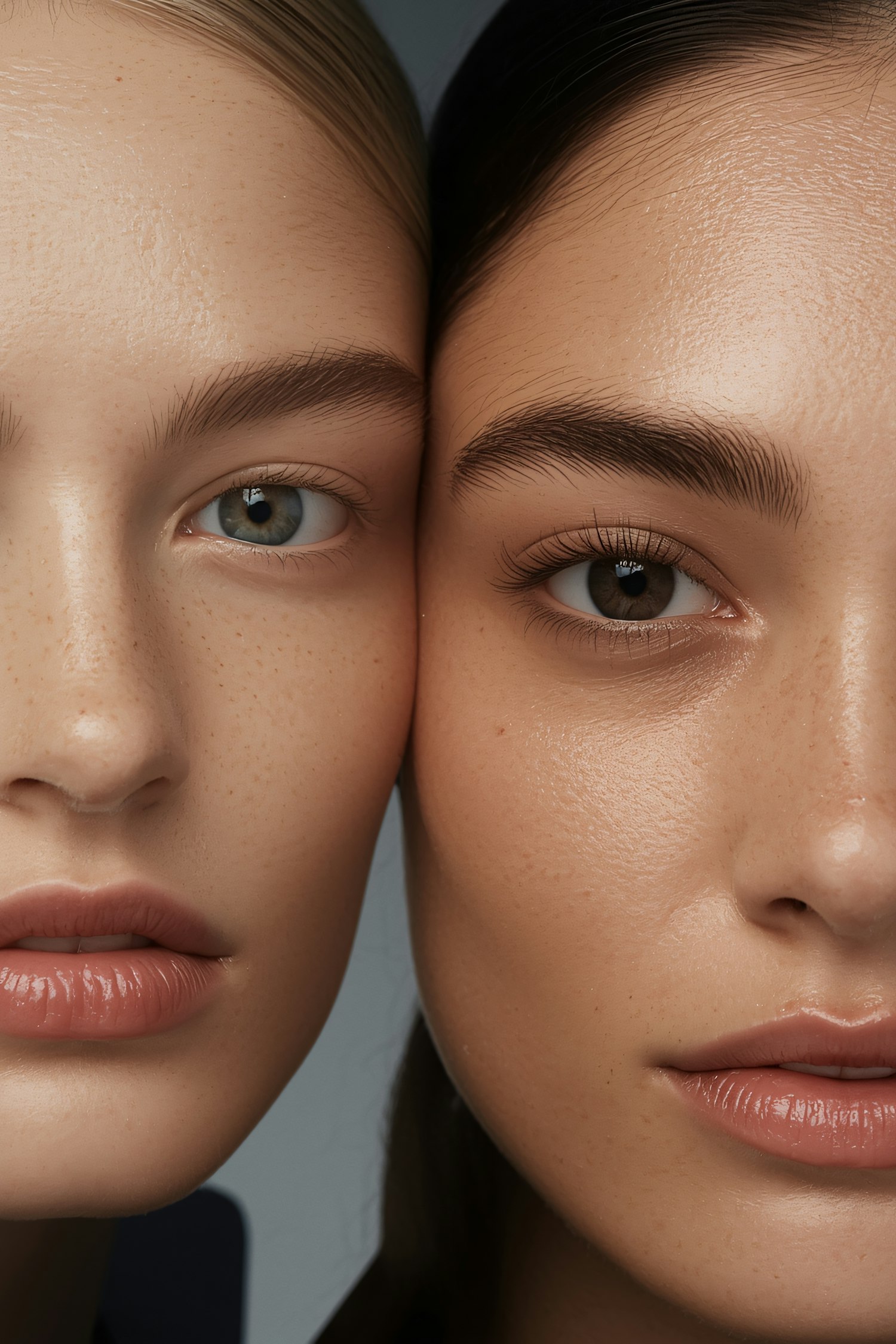 Close-up of two individuals' faces, showcasing their natural beauty, skin texture, and contrasting features in a neutral setting.