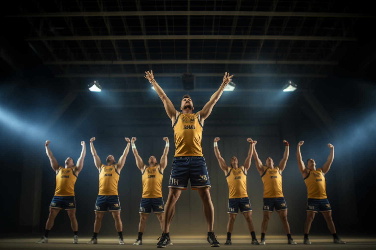 Seven men in yellow and blue athletic gear strike a powerful pose in a dimly lit indoor space, exuding strength and unity.
