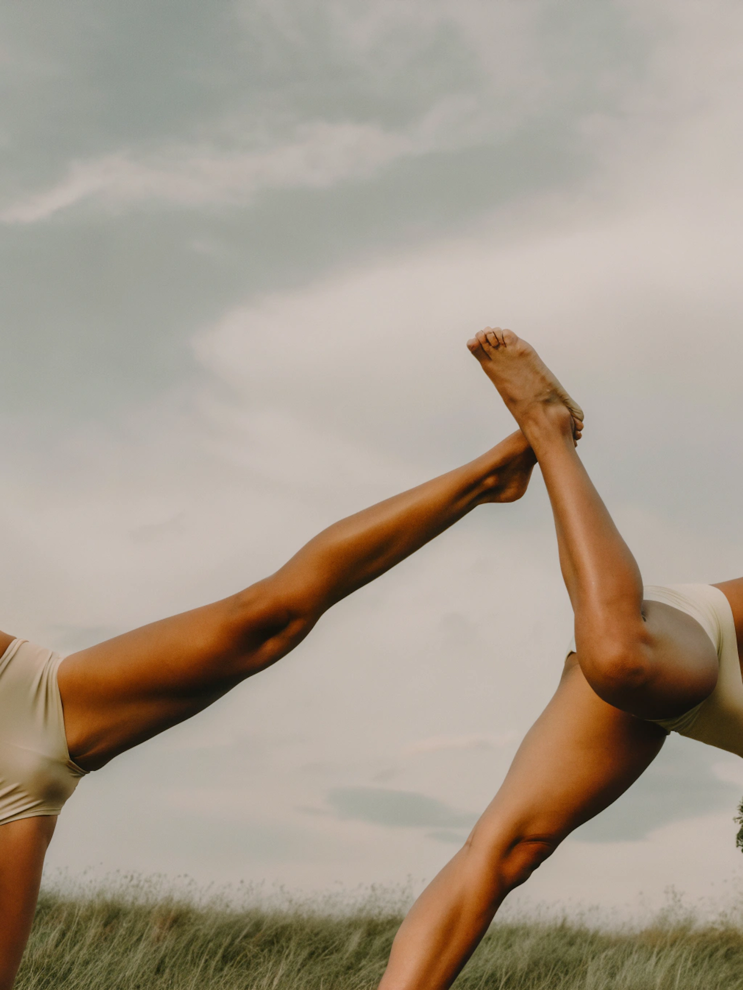 Two individuals outdoors in a synchronized leg pose, set against a grassy field and cloudy sky, emphasizing balance and symmetry.