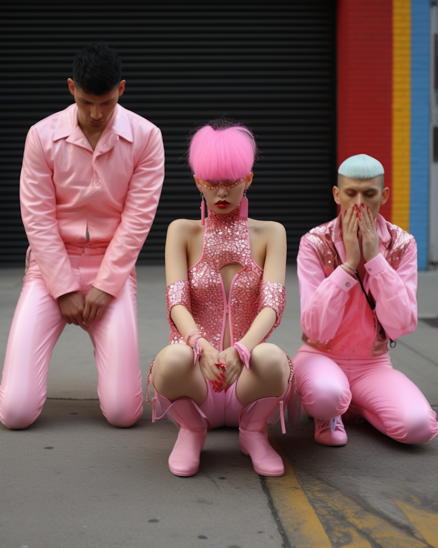 Three individuals in bold pink outfits pose dramatically against an industrial backdrop, showcasing avant-garde fashion and striking hairstyles.