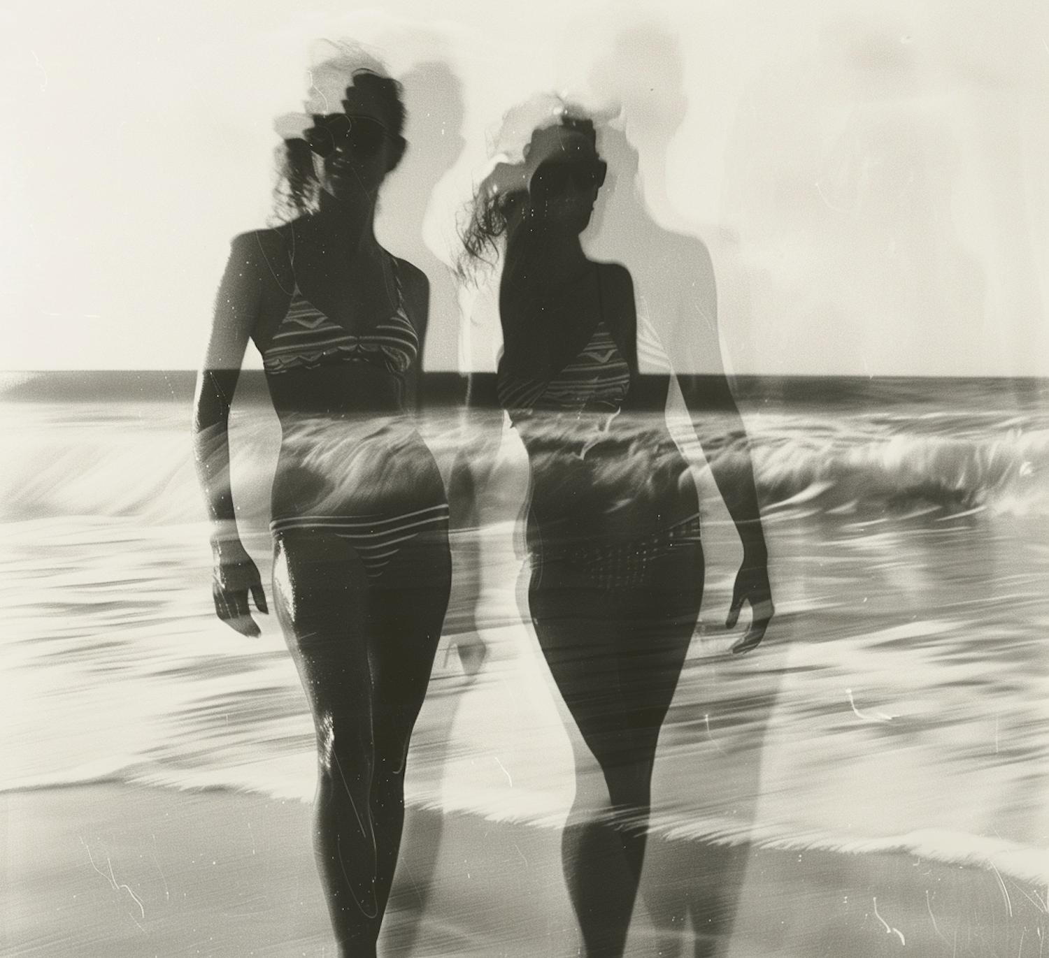 Double exposure of two women in bikinis walking on a beach, blending with ocean waves in a dreamy black and white scene.