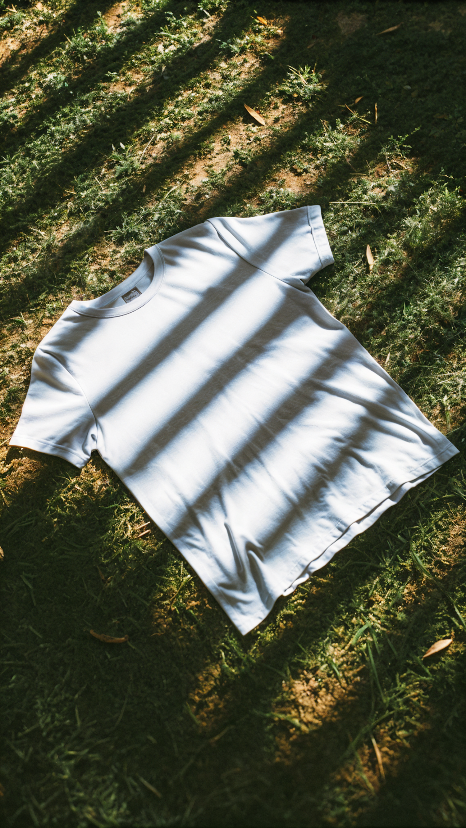White T-shirt on grass with striped sunlight shadows, creating a natural and serene outdoor scene.