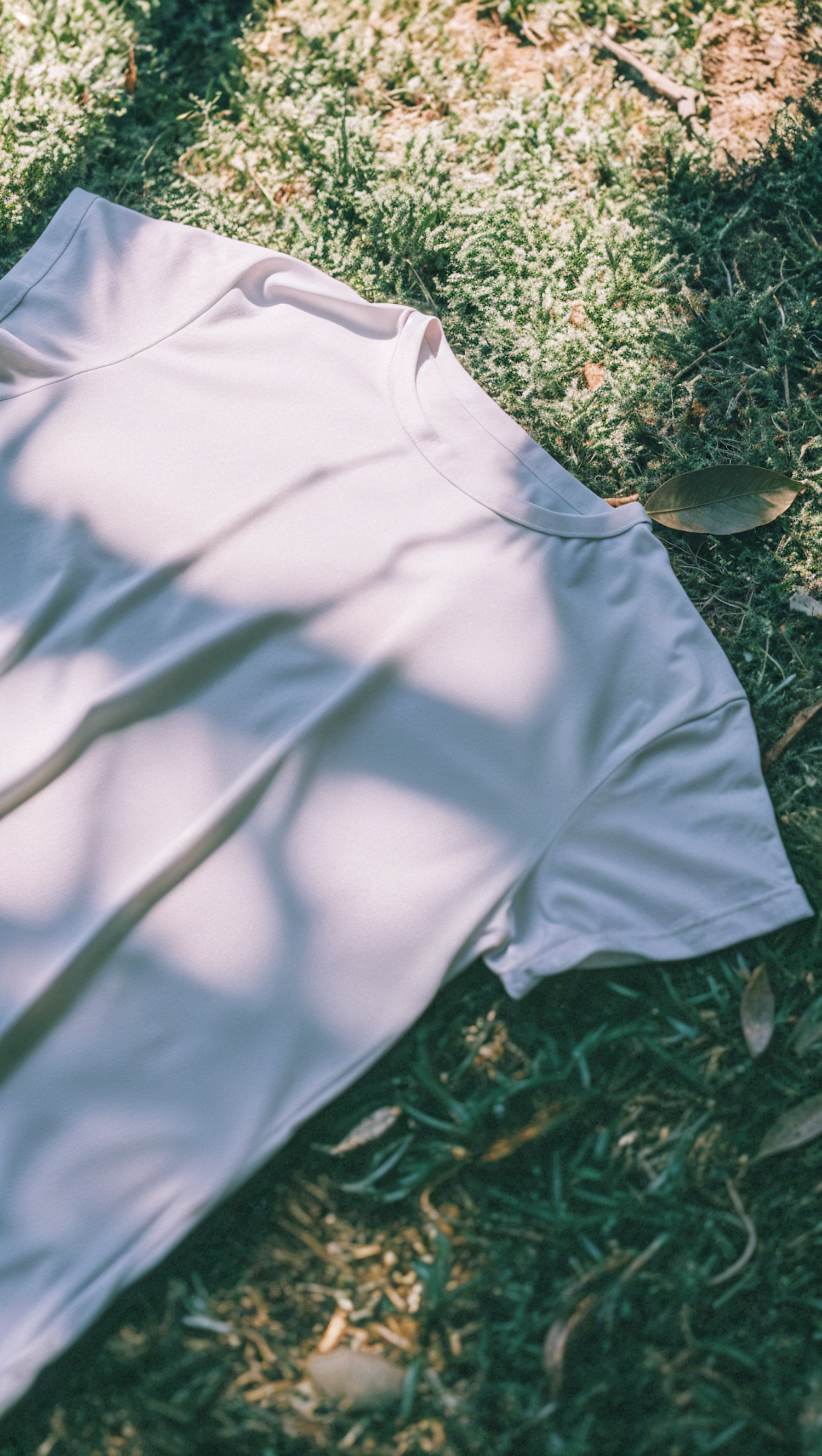 White T-shirt on grass with dappled sunlight and leaf shadows, creating a serene outdoor scene.