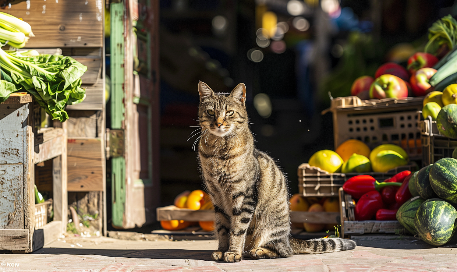 A tabby cat sits in a sunlit market surrounded by colorful fruits and vegetables, creating a lively and inviting scene.