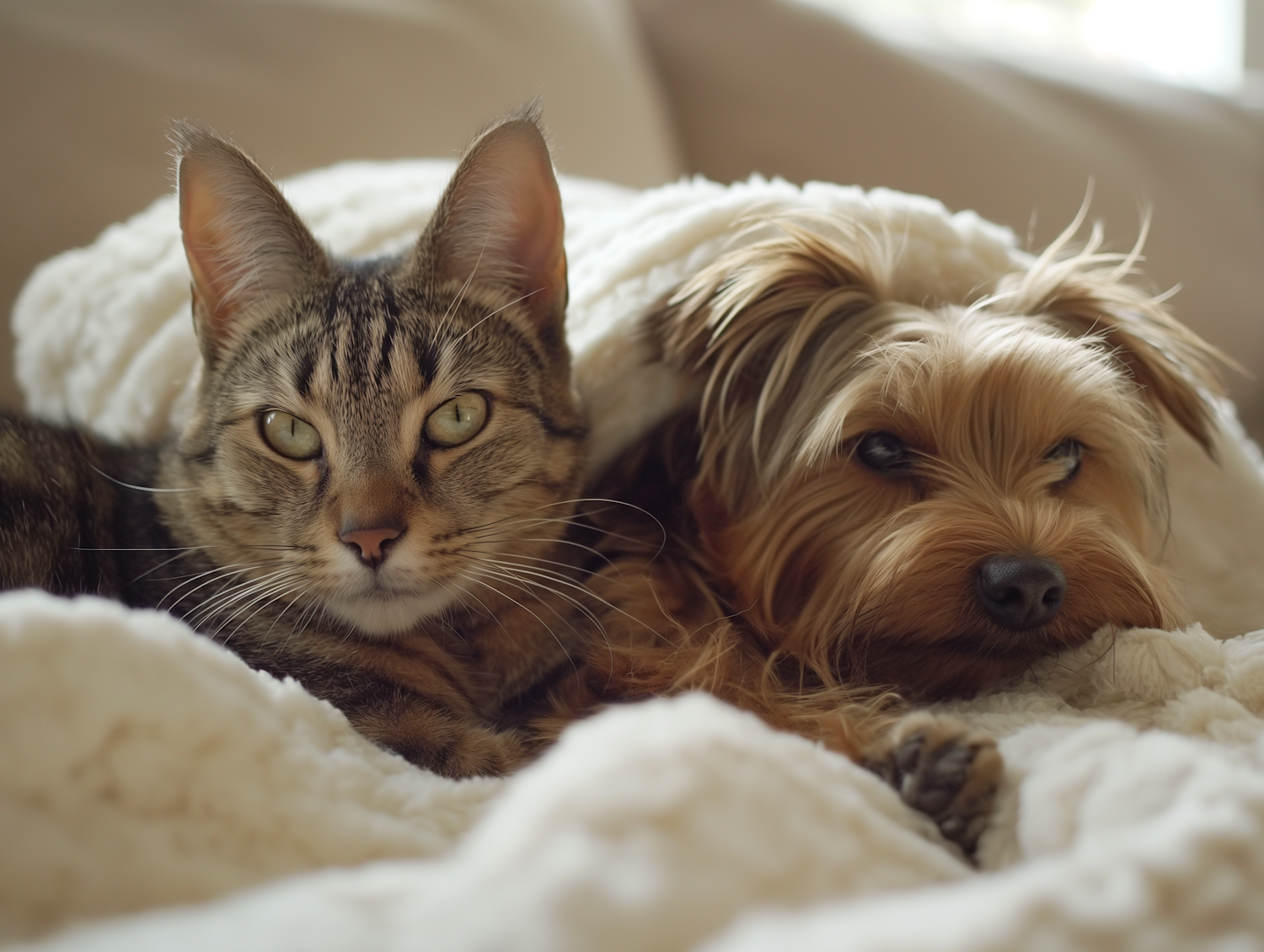 A tabby cat and a small dog snuggle under a soft blanket, creating a cozy and heartwarming scene of companionship.