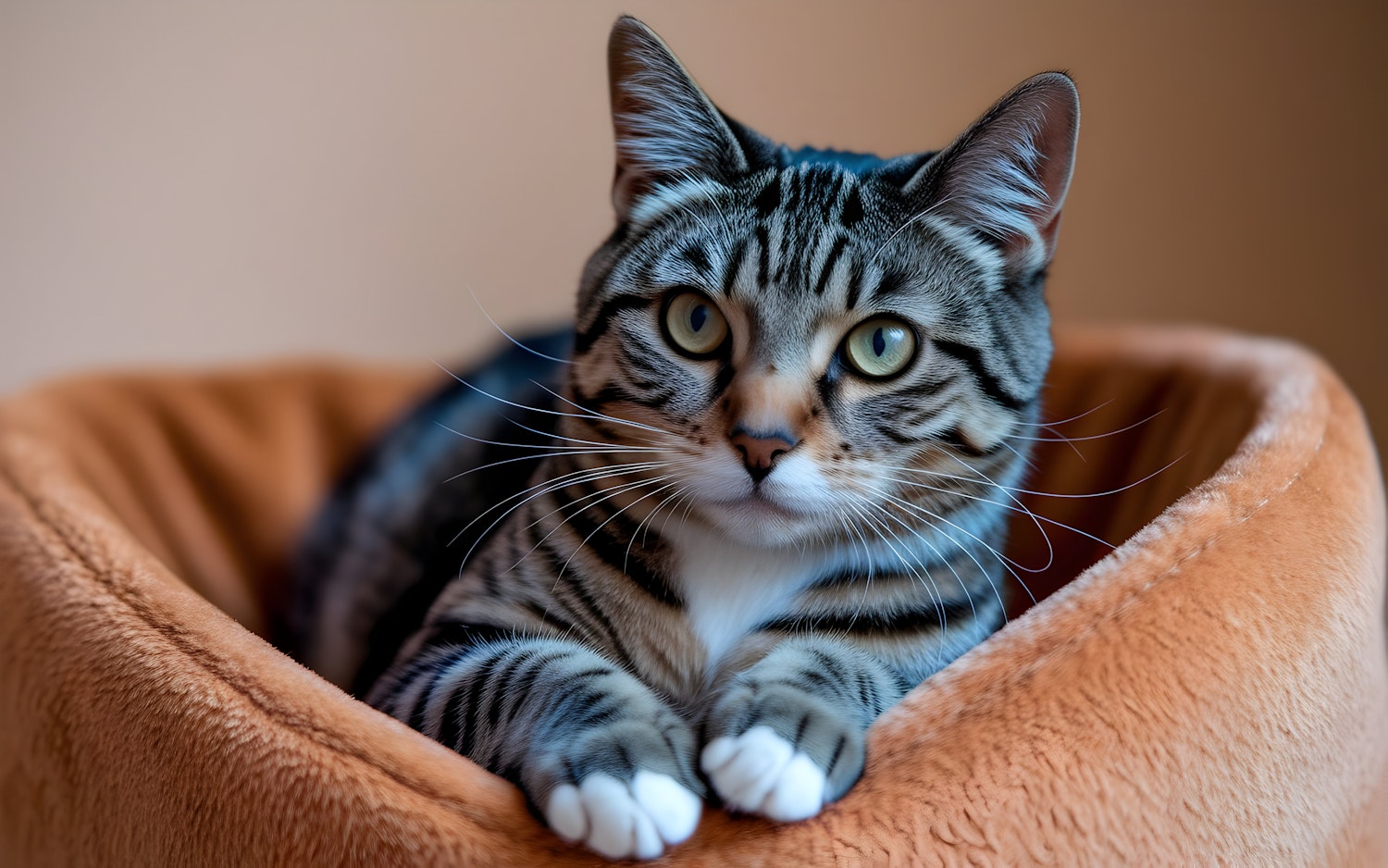Adorable tabby cat with greenish-yellow eyes lounging in a soft, light brown bed. Perfect cozy moment for cat lovers!