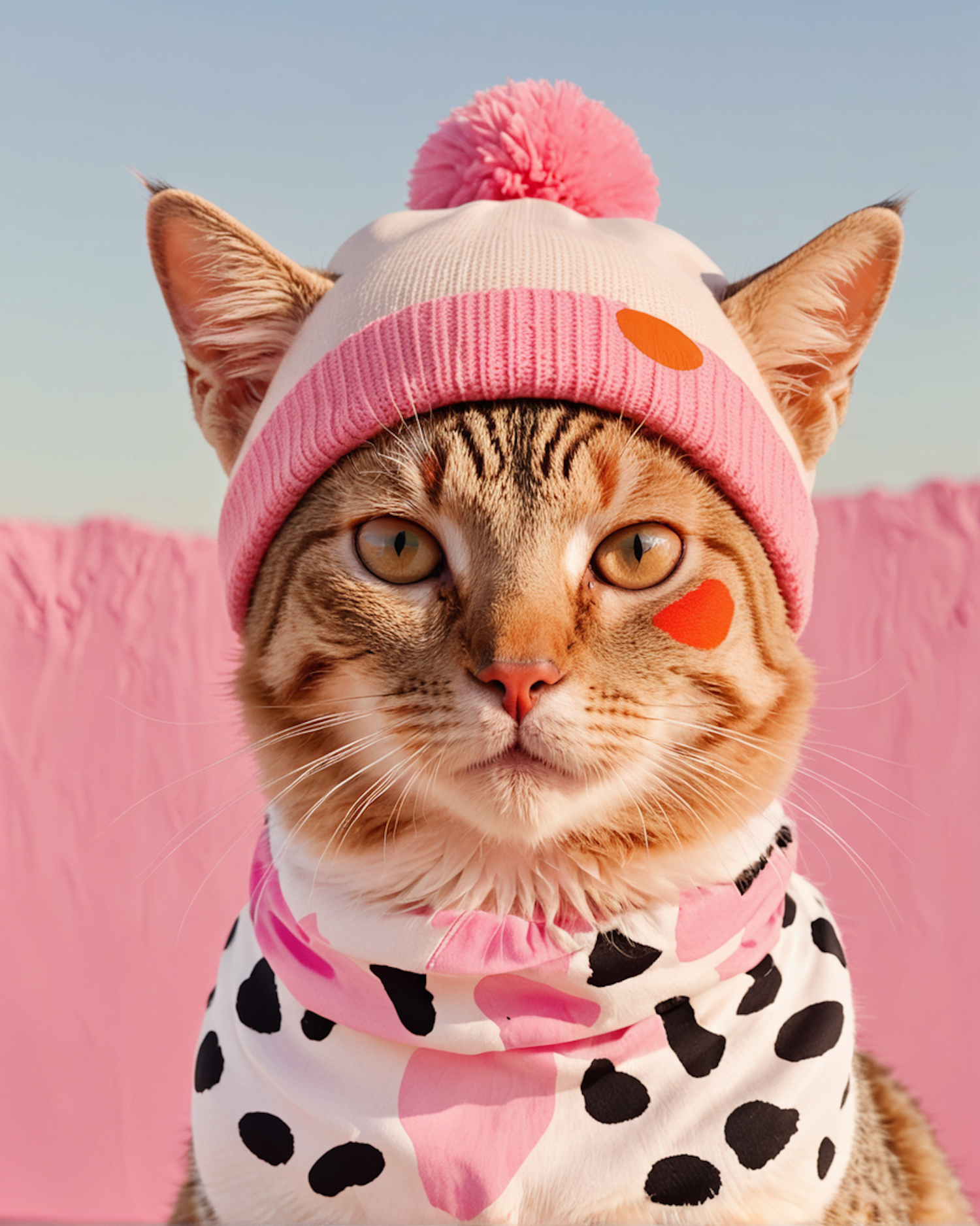 Adorable tabby cat in a pink beanie and polka-dot scarf, with a heart sticker on its cheek, set against a pastel pink and blue background.