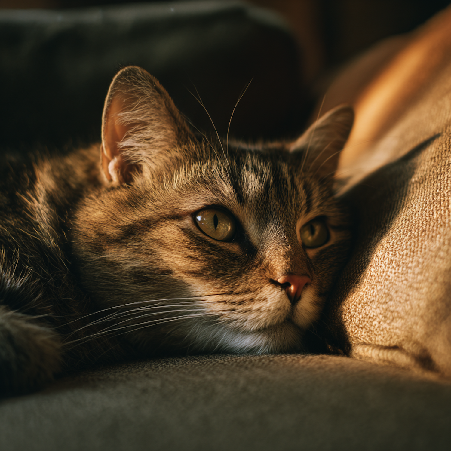 A close-up of a tabby cat resting in warm sunlight, showcasing its striped fur and green eyes in a serene and cozy setting.
