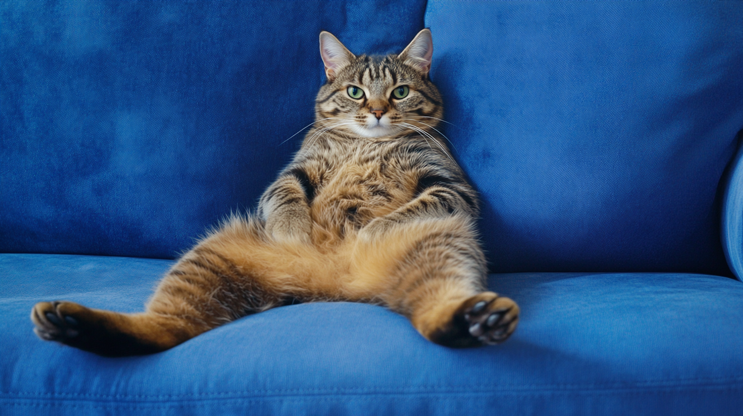 A tabby cat with green eyes lounges humorously on a blue sofa, sitting upright with a relaxed pose. Cozy and amusing feline moment.