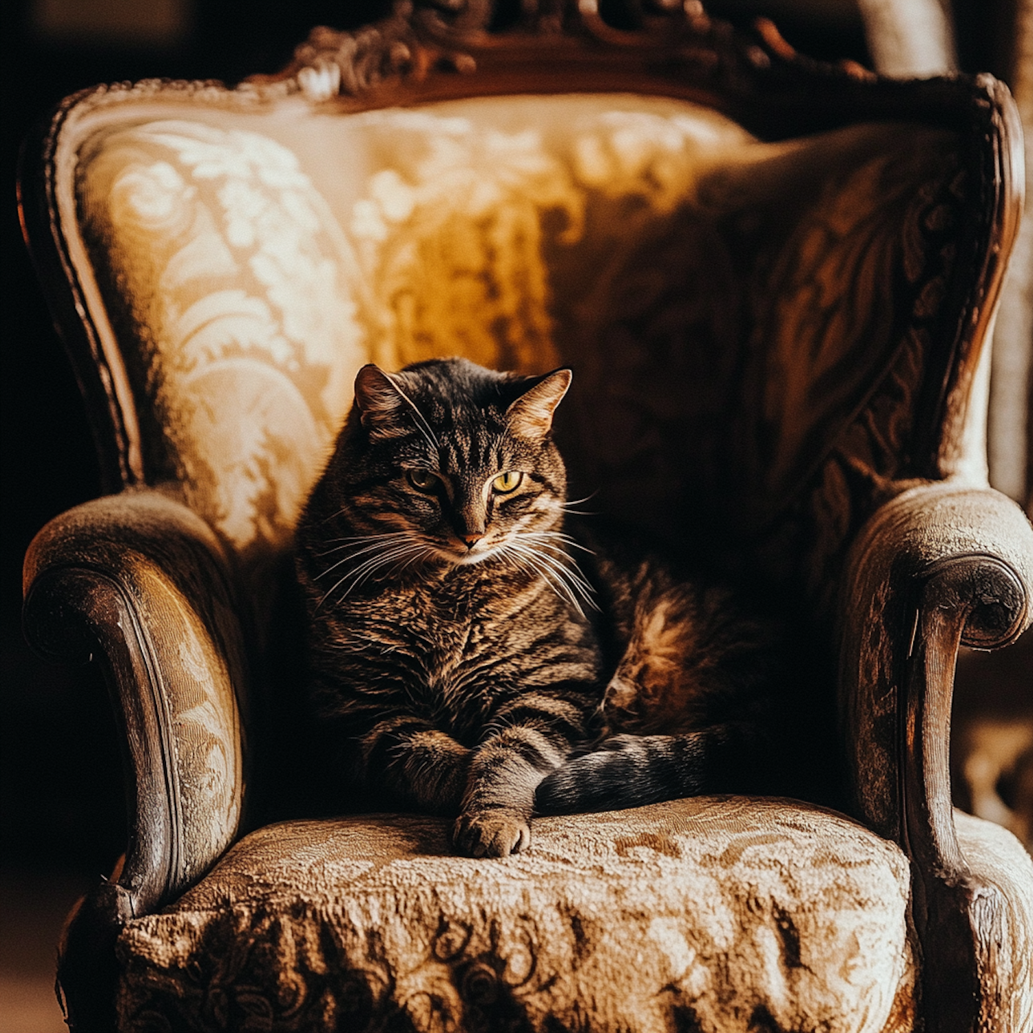 A tabby cat lounges on a vintage golden armchair with intricate carvings, bathed in warm light for a regal and cozy ambiance.