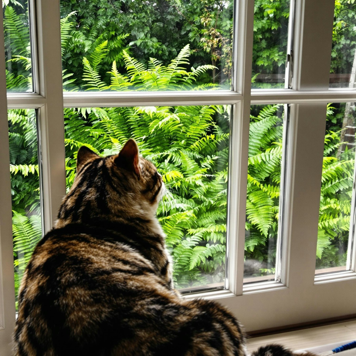 A tabby cat sits on a windowsill, gazing at lush green ferns outside a white-paned window. A serene and cozy moment captured.