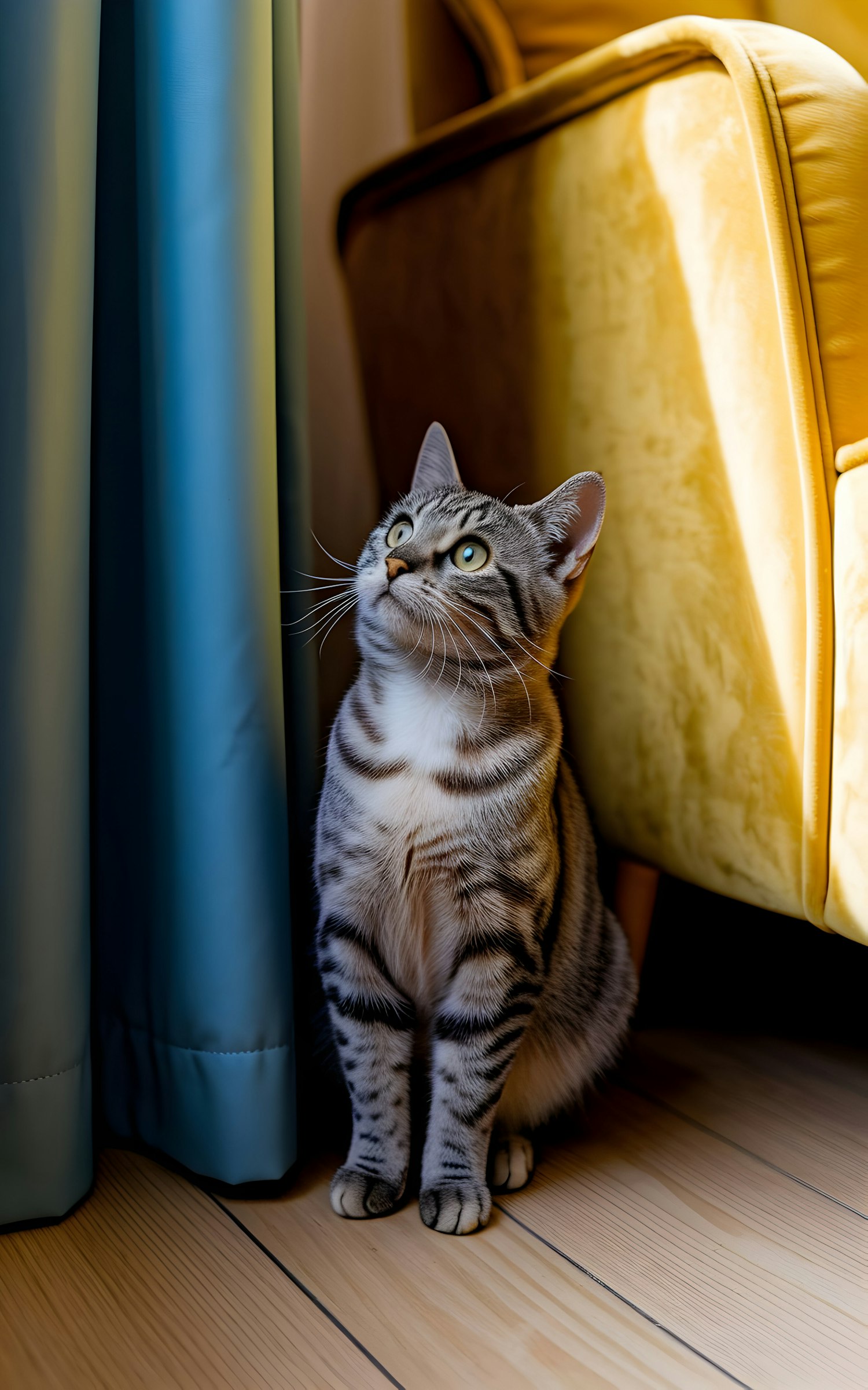 A curious tabby cat with green eyes sits on a wooden floor, framed by a teal curtain and a mustard-yellow armchair in soft lighting.