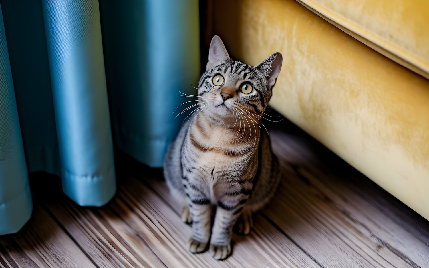 Adorable tabby cat with yellow-green eyes sitting on a wooden floor, framed by a blue curtain and yellow couch. Perfect cozy home vibe!