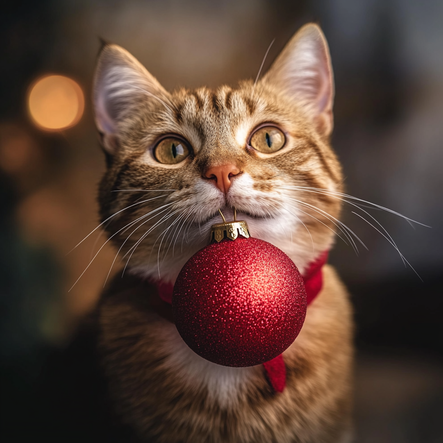 Adorable tabby cat with amber eyes holding a red Christmas ornament, set against a warm, festive bokeh background.