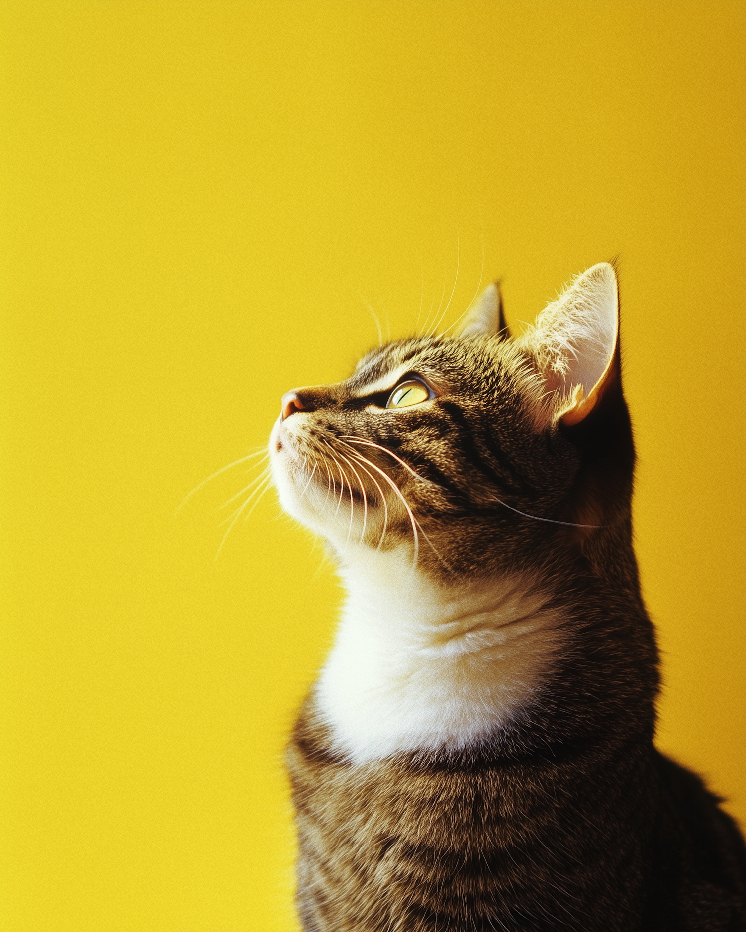Tabby cat with striking stripes gazes upward against a vibrant yellow background, creating a bold contrast and highlighting its features.
