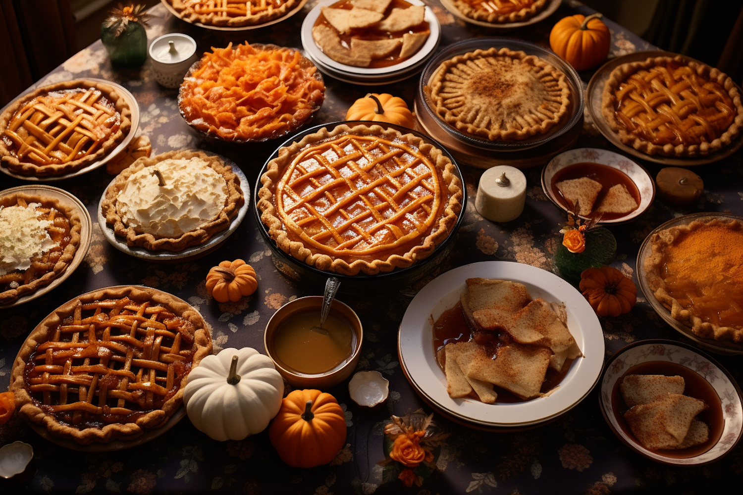 A festive table filled with various pies, decorative pumpkins, and candles, creating a warm autumn atmosphere.