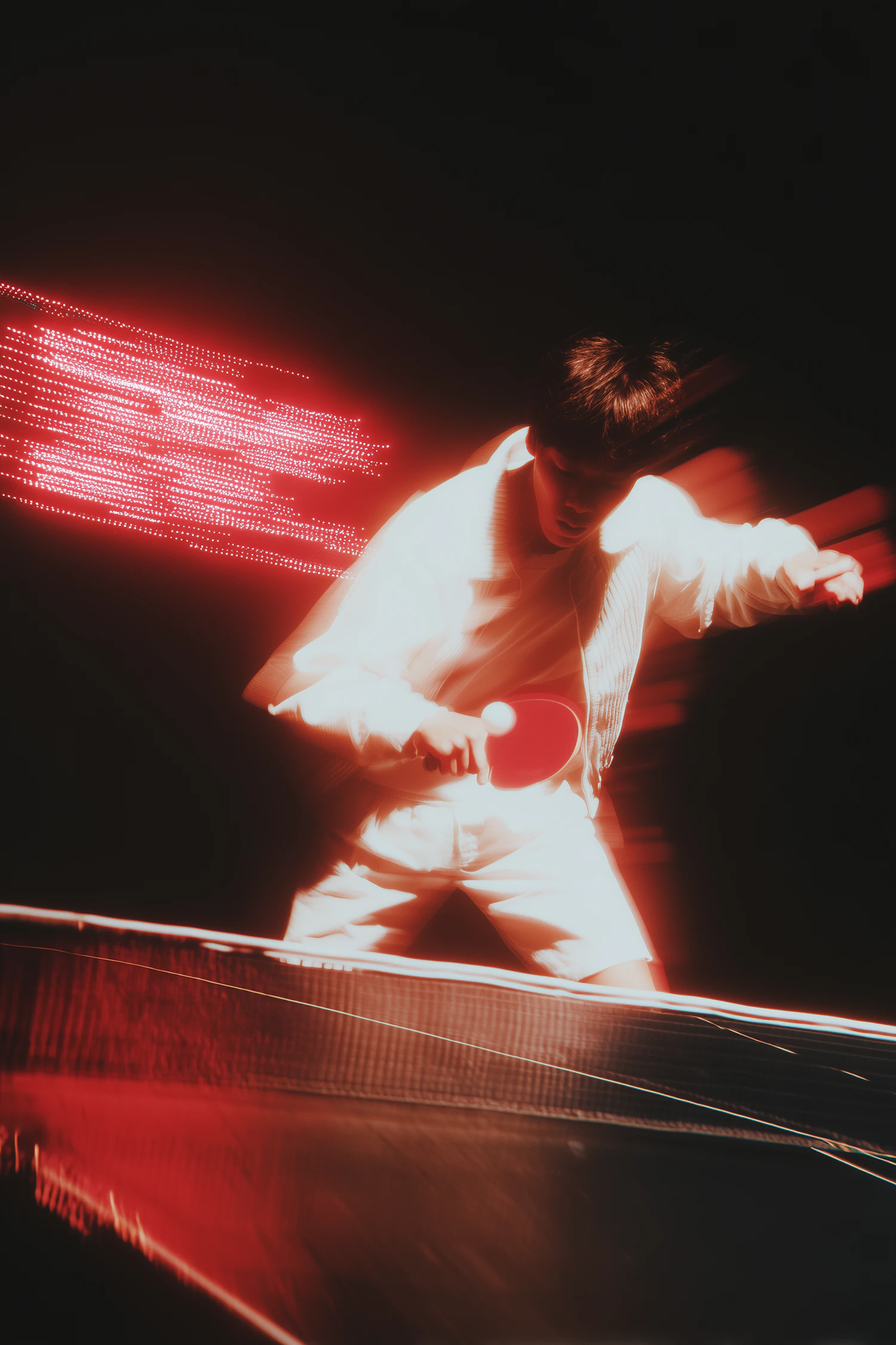 A dynamic shot of a table tennis player in motion, with dramatic red lighting and motion blur effects creating an energetic vibe.