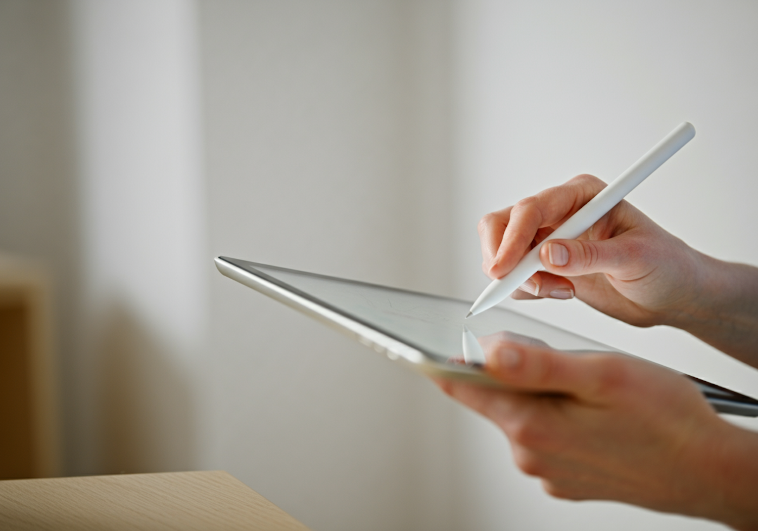 Close-up of hands using a white stylus on a sleek tablet, showcasing modern technology and precision interaction.