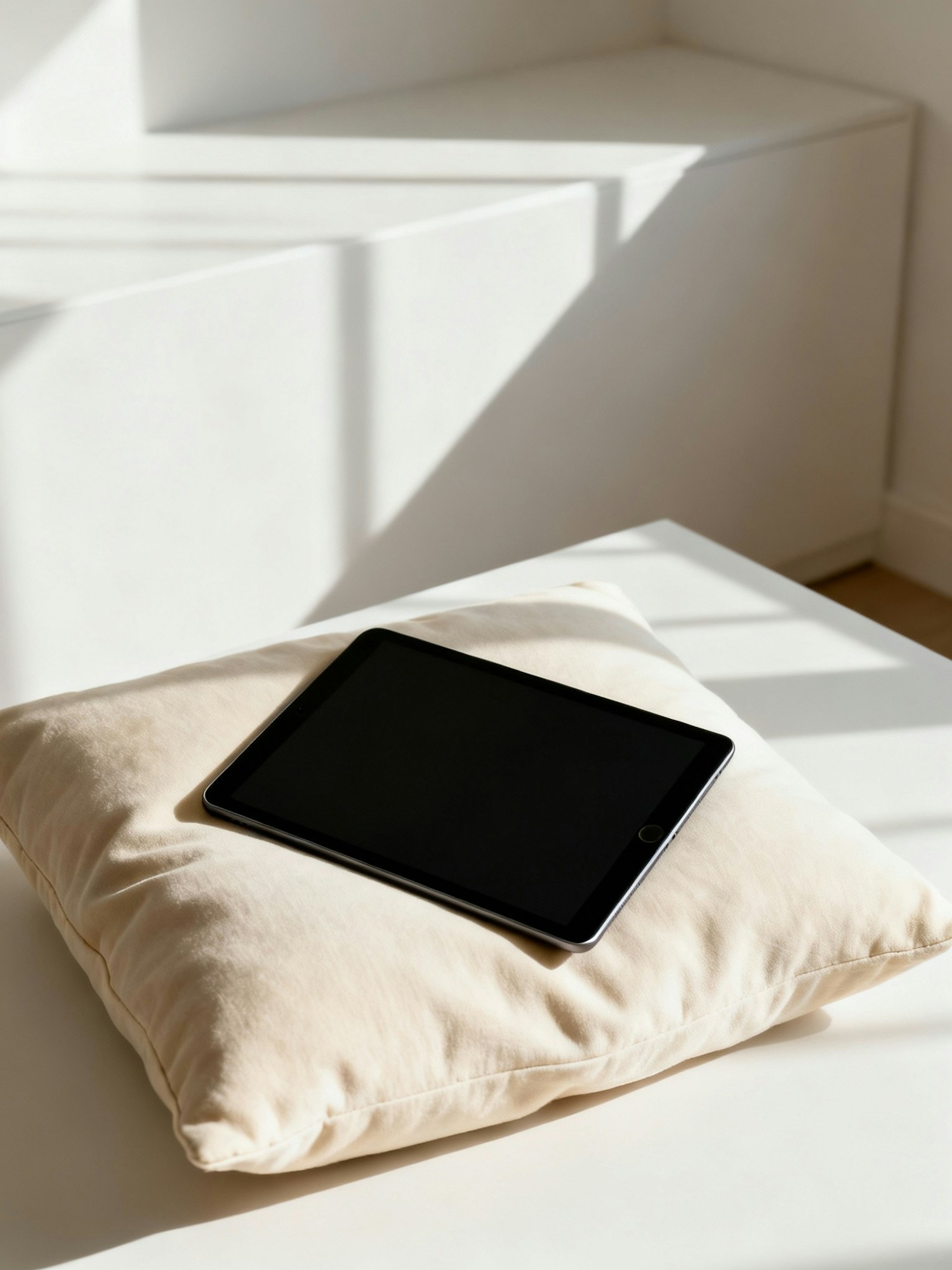 A sleek tablet rests on a beige pillow in a sunlit, minimalist setting, creating a serene and modern aesthetic.