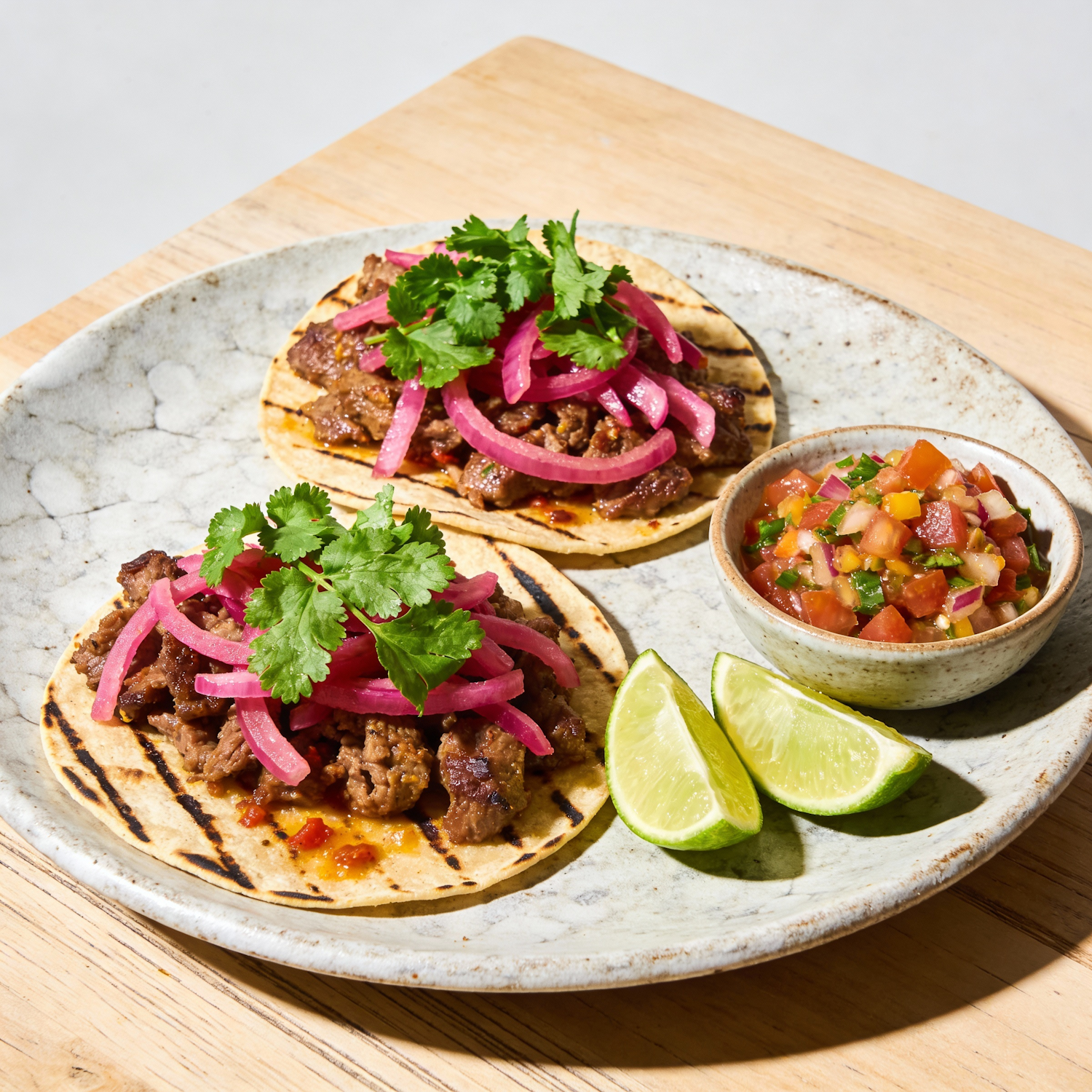 Delicious tacos with beef, pickled onions, and cilantro, served with pico de gallo and lime wedges on a rustic plate.