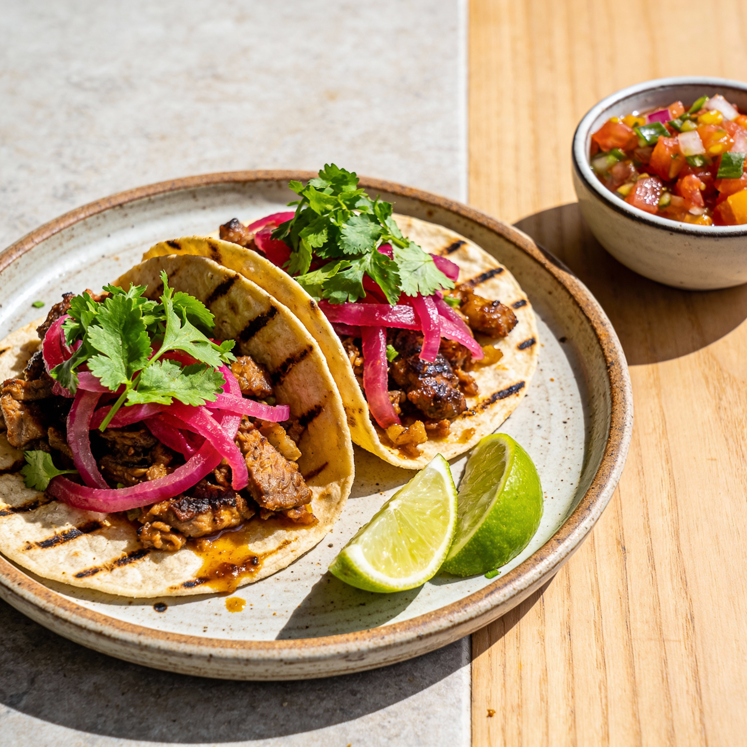 Authentic modern Mexican restaurant photo campaign, natural daylight, vibrant lively colors, realistic casual photography, true-to-life tones, bright fresh ingredients, minimal contemporary styling, handmade ceramic plates, light wood and pale stone textures, clean background, spontaneous feel, candid moment, slight imperfections, no heavy editing, no cinematic grading, no film look, no cliché decorations, close-up photo of two grilled tacos on a handmade ceramic plate and a wood table, fresh bright cilantro, vivid pickled red onions, lime wedges, colorful salsa on the side, juicy textures, natural shadows, slightly messy plating like a real restaurant dish, simple table setting, bright and vibrant food colors, realistic casual shot, no smoke