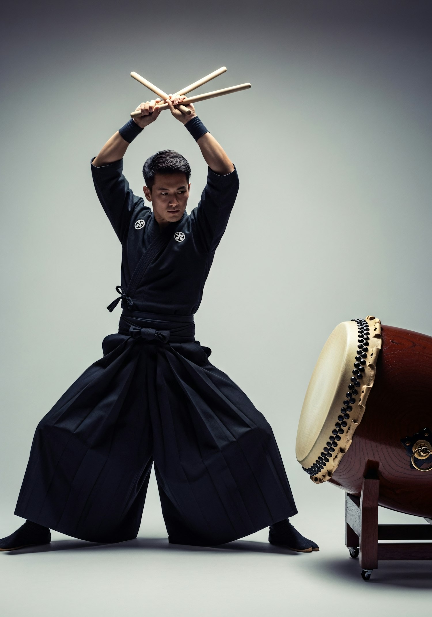 A taiko drummer in traditional attire performs dynamically with a large drum, showcasing cultural artistry and precision.