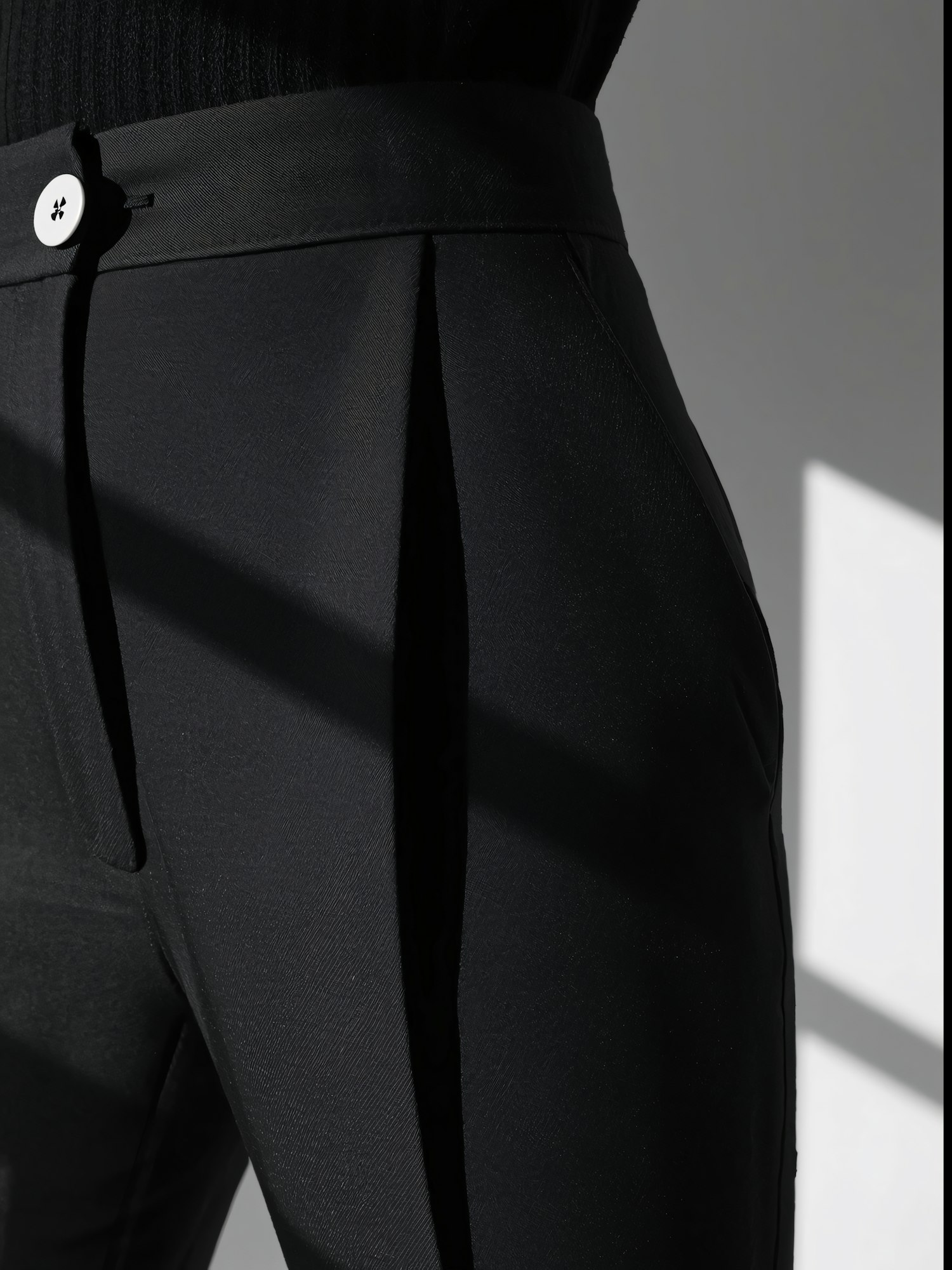 Close-up of black tailored pants with a white button, highlighting the fabric's texture and design details under soft lighting.
