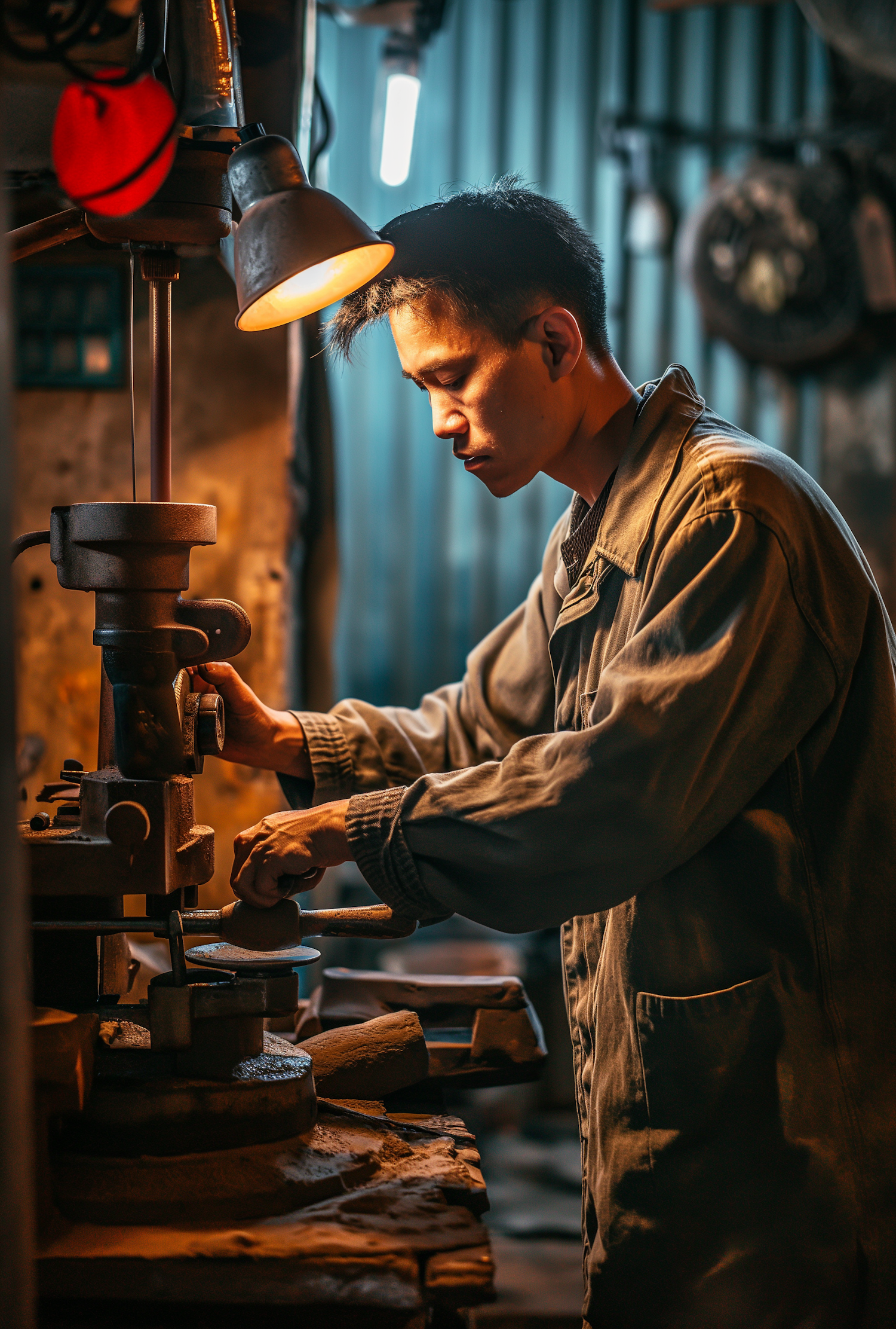 Asian man in a workshop operating machinery under warm lighting, focused and serious, with industrial tools in the background.