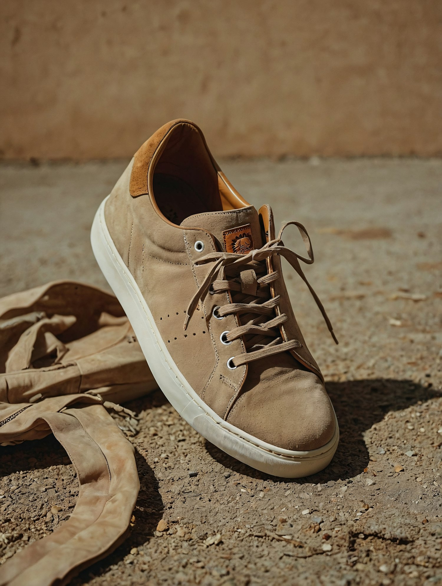 Beige leather sneaker with suede heel on textured ground, featuring white sole and warm lighting for a rustic, natural look.