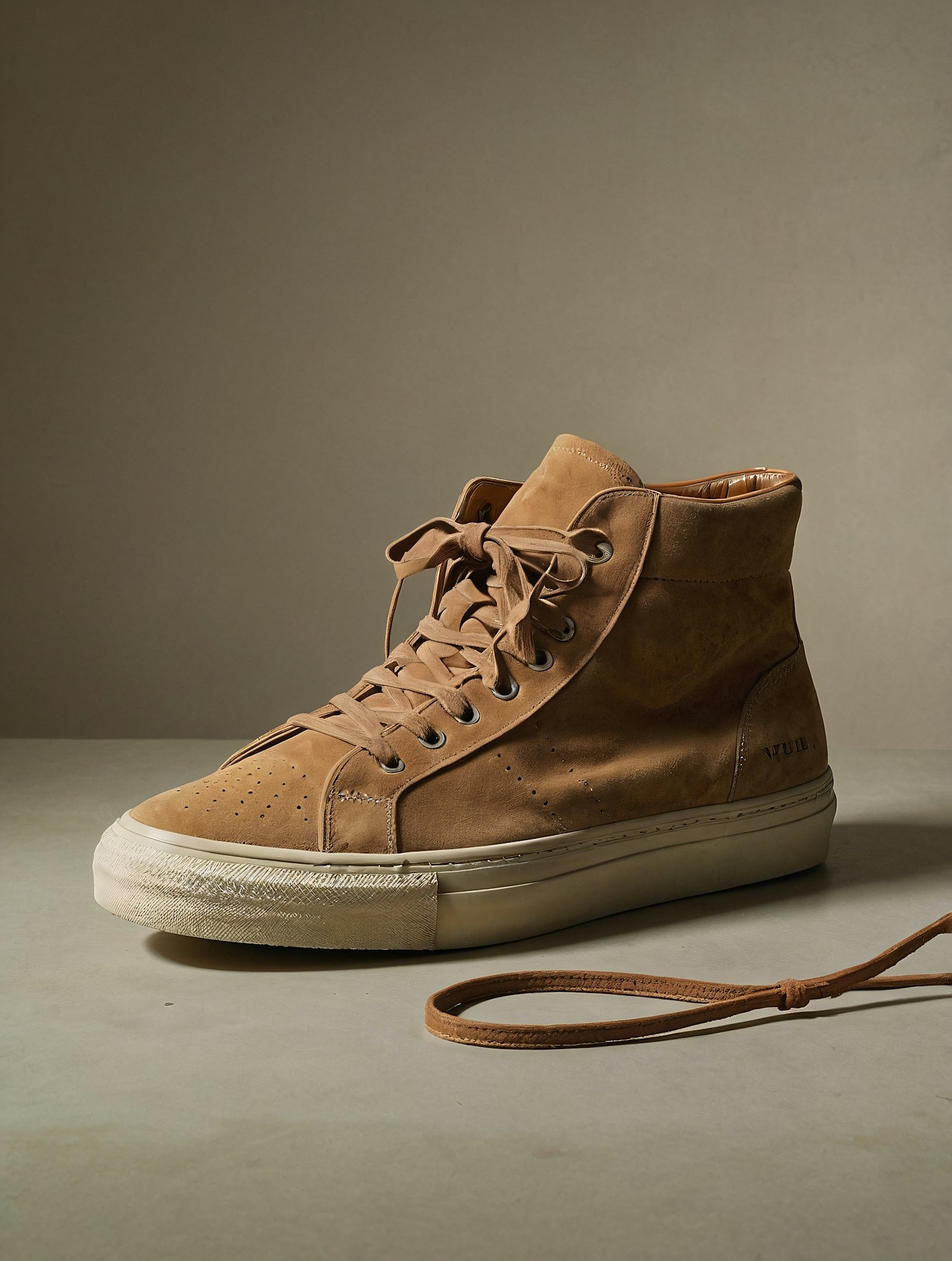 Tan suede high-top sneaker with perforated toe box, white rubber sole, and subtle 'ZUR' branding, displayed with untied laces.