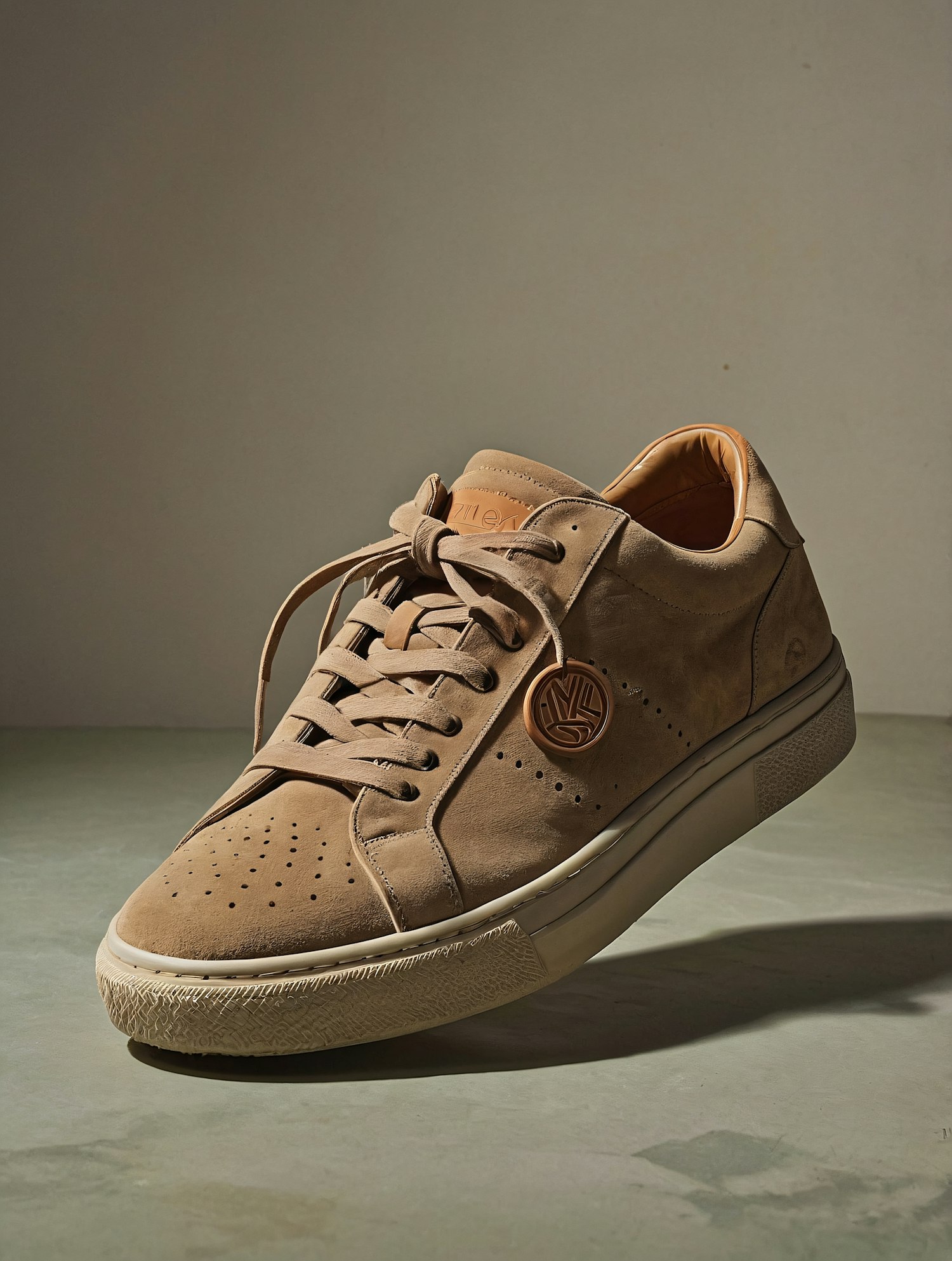 Tan suede sneaker with perforated design and circular emblem, set against a neutral background. Stylish and modern footwear.