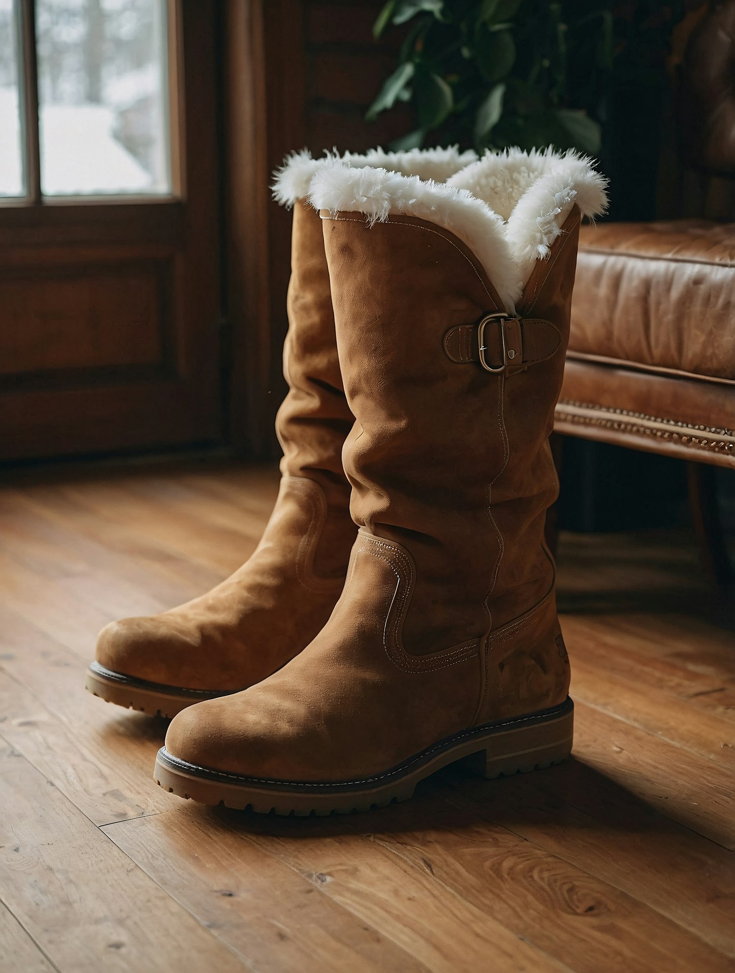 Stylish tan suede winter boots with fluffy white fur lining, perfect for cold weather, set against a cozy rustic wooden interior.