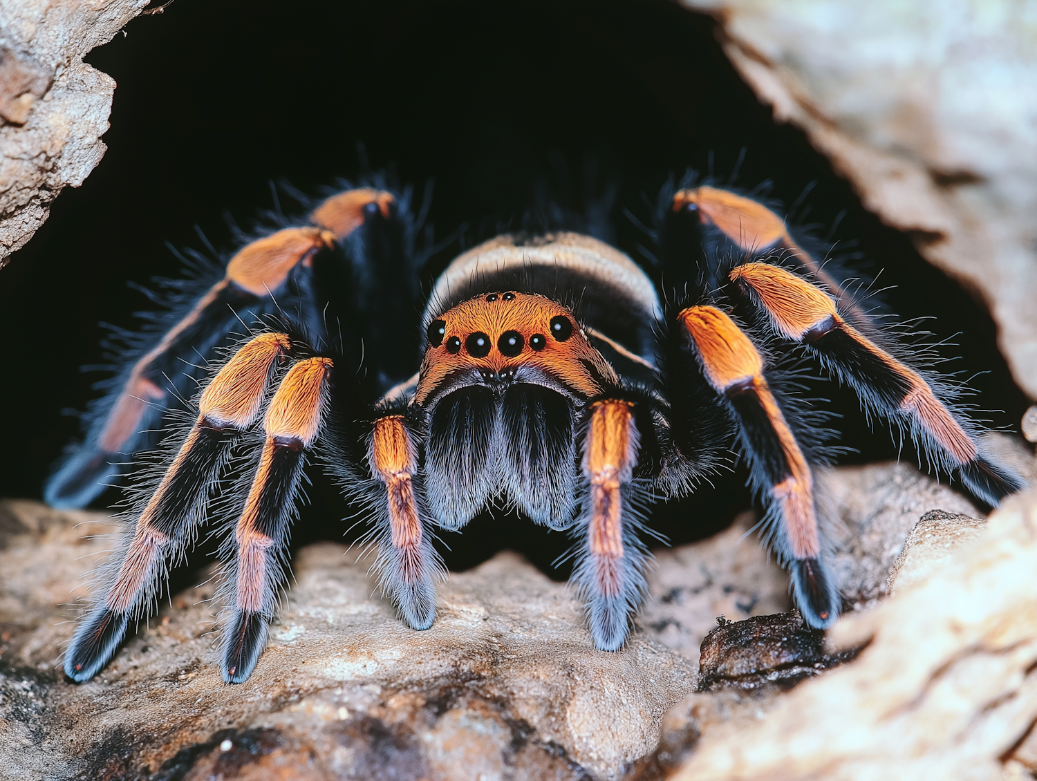 Close-up of a vibrant orange and black tarantula emerging from a rocky crevice, showcasing its striking patterns and hairy texture.