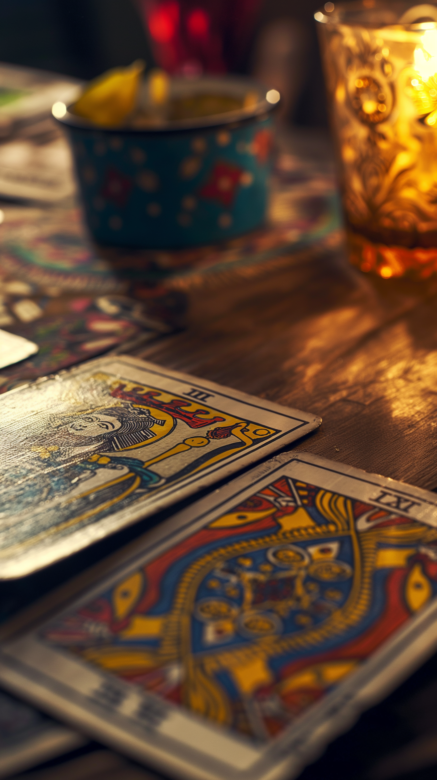 Mystical tarot cards on a wooden table, illuminated by warm candlelight, creating an intimate and reflective atmosphere.