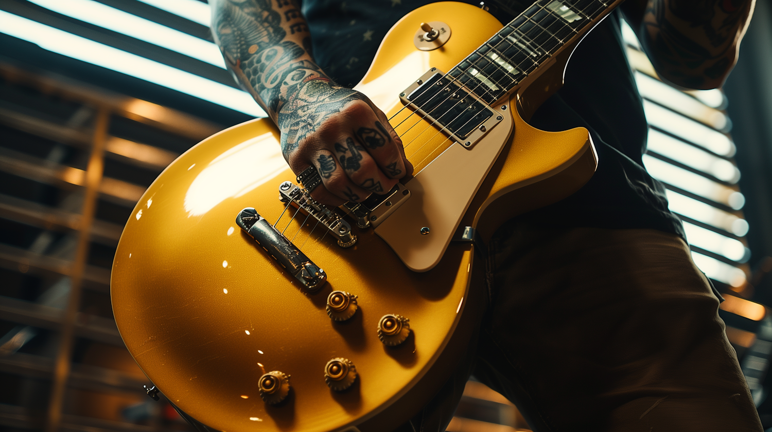 Close-up of a tattooed hand playing a golden electric guitar with a glossy finish, set against a blurred background with light lines.