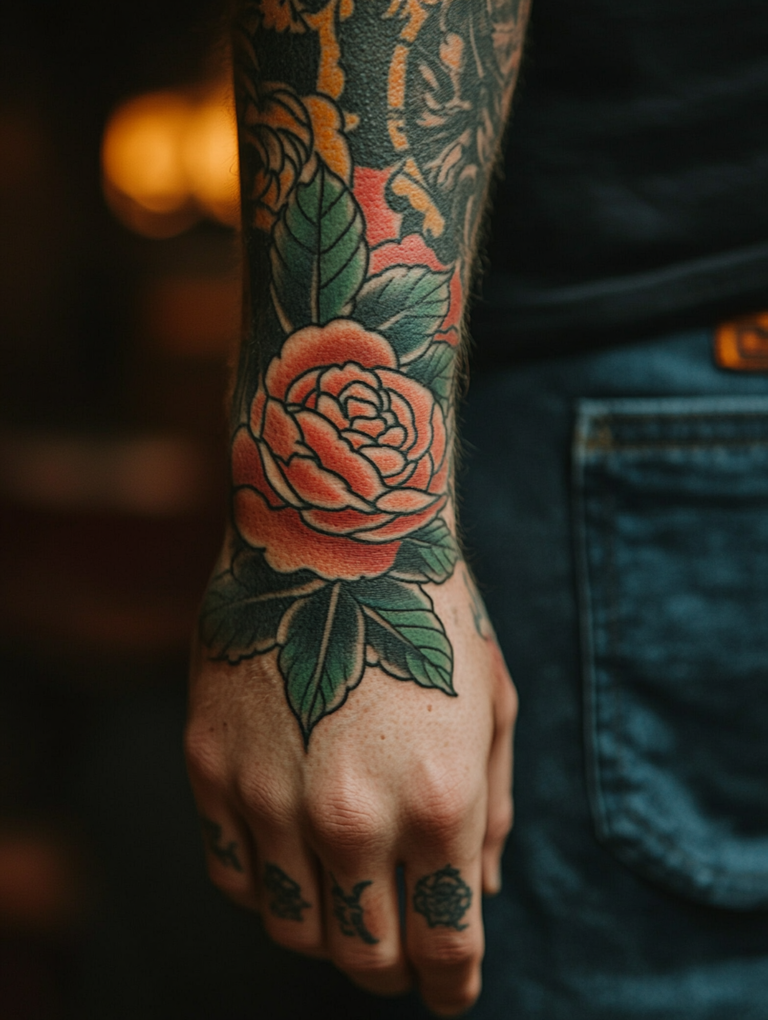 Close-up of a tattooed hand and forearm with a vibrant rose design and finger tattoos, set against a blurred background.