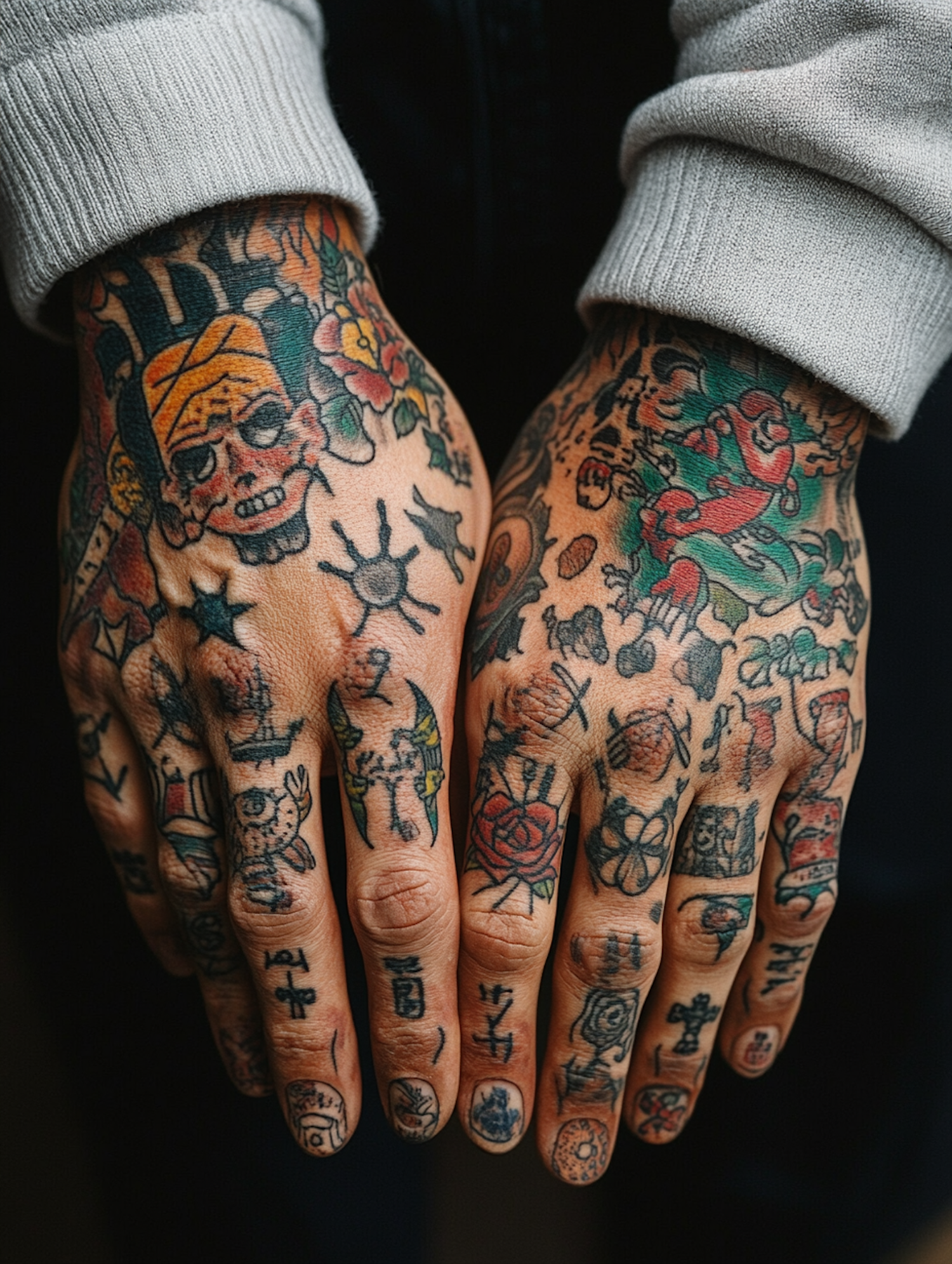Close-up of tattooed hands with vibrant designs, including skulls, roses, and symbols, set against a dark background.