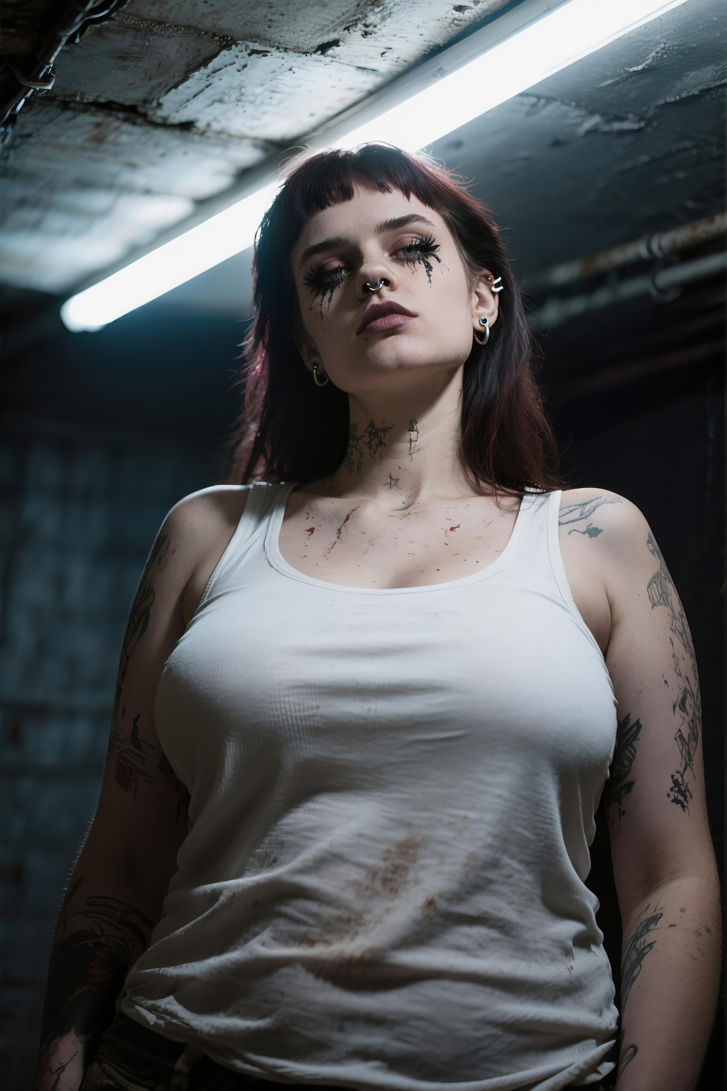 A person with tattoos and piercings in a white tank top, standing in a dimly lit industrial setting with dramatic lighting.