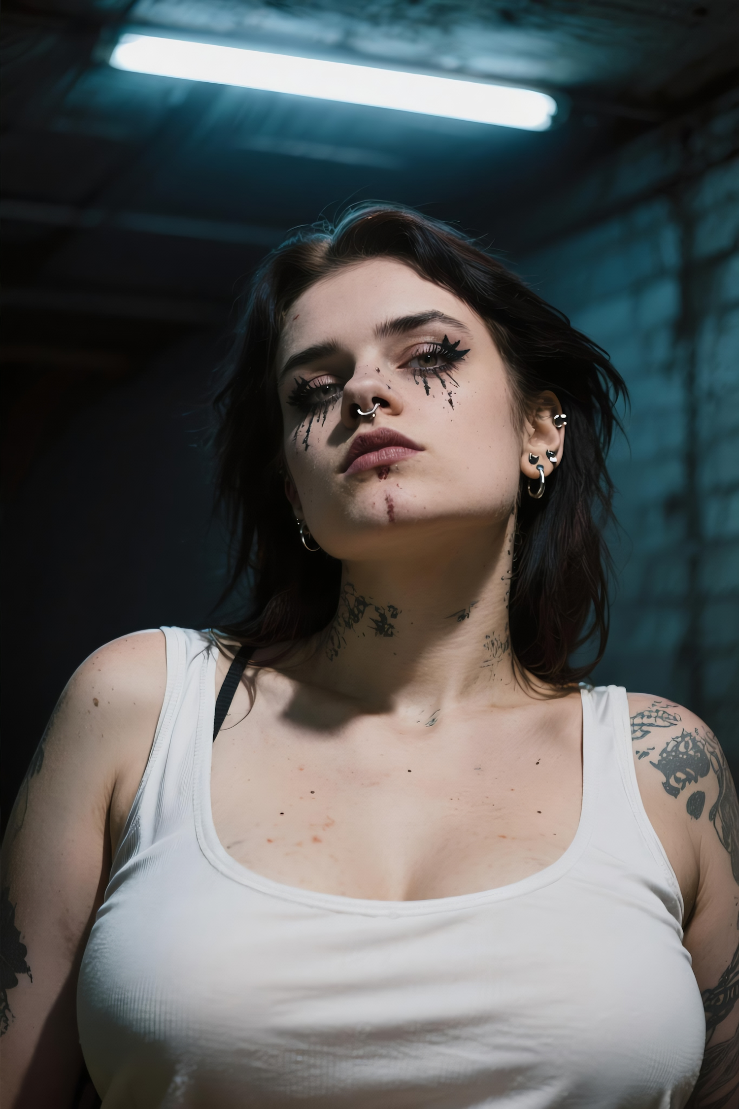 A person with dramatic makeup, tattoos, and piercings in a dimly lit industrial setting, wearing a white tank top.