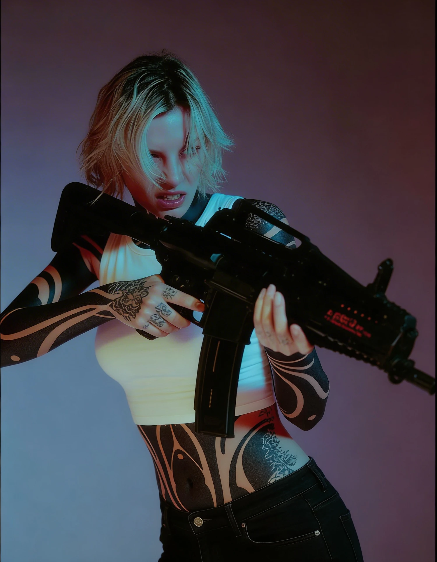 A person with tattoos and blonde hair holding a firearm against a vibrant gradient background, creating a dramatic and intense scene.