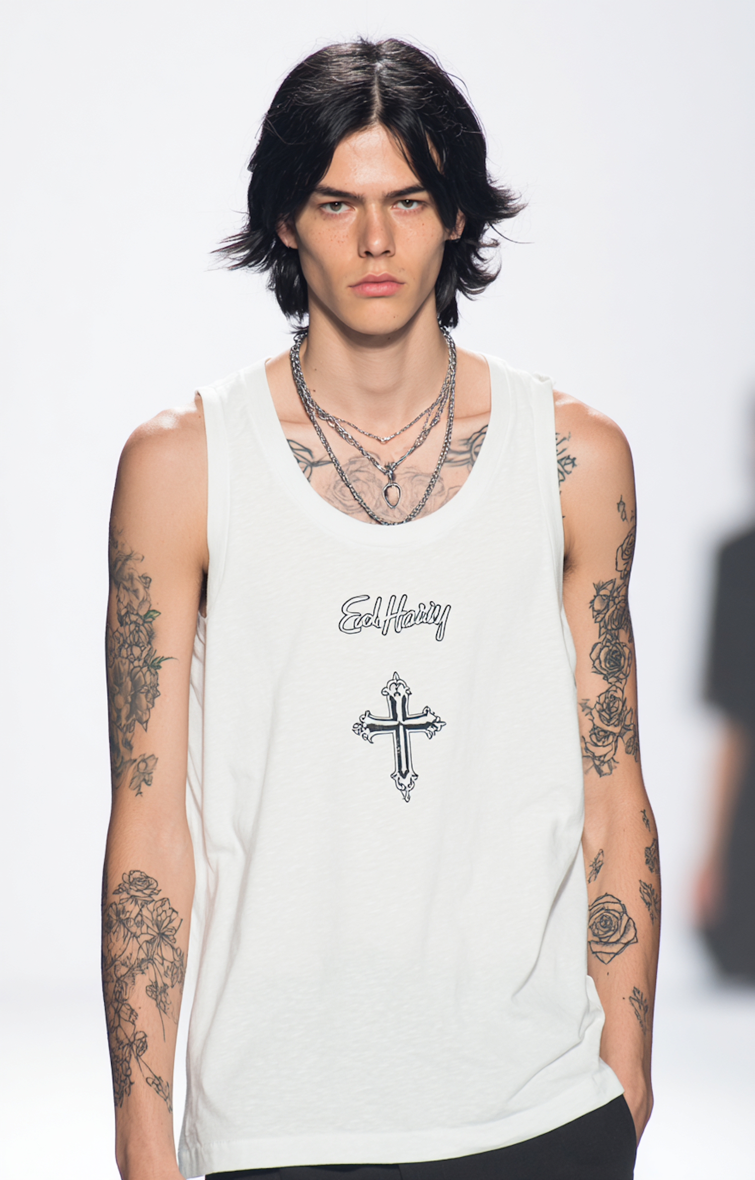 Individual wearing a white graphic tank top with accessories and inked arms, seen on a clean white background.
