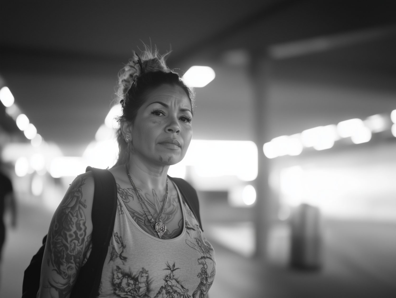 Black-and-white portrait of a tattooed woman in an urban setting, with a serious expression and blurred bokeh lights in the background.