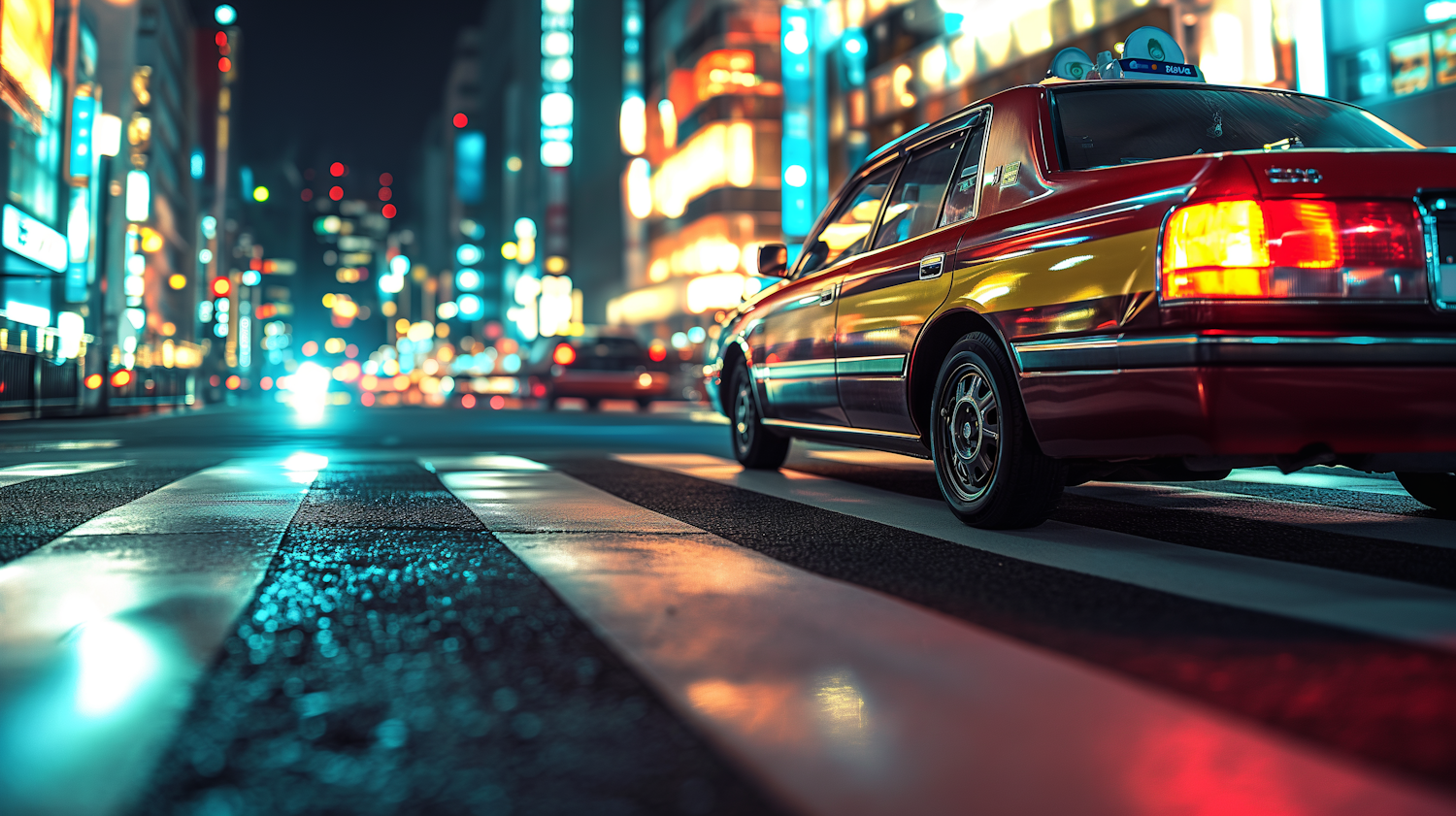 Vibrant city street at night with a red and yellow taxi on a wet zebra crossing, reflecting neon lights.